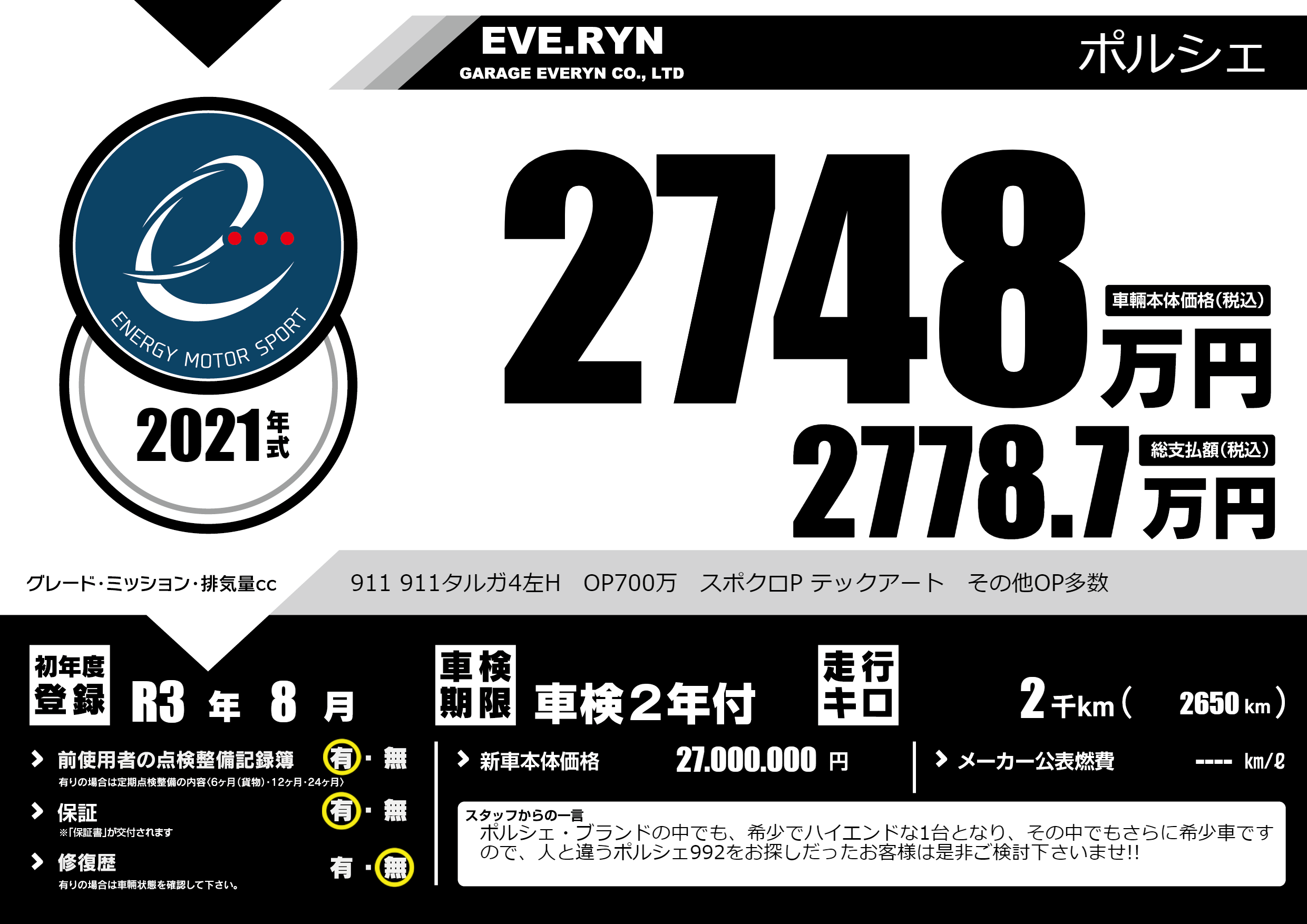 911 911タルガ4左H OP700万 スポクロP テックアート その他OP多数 |