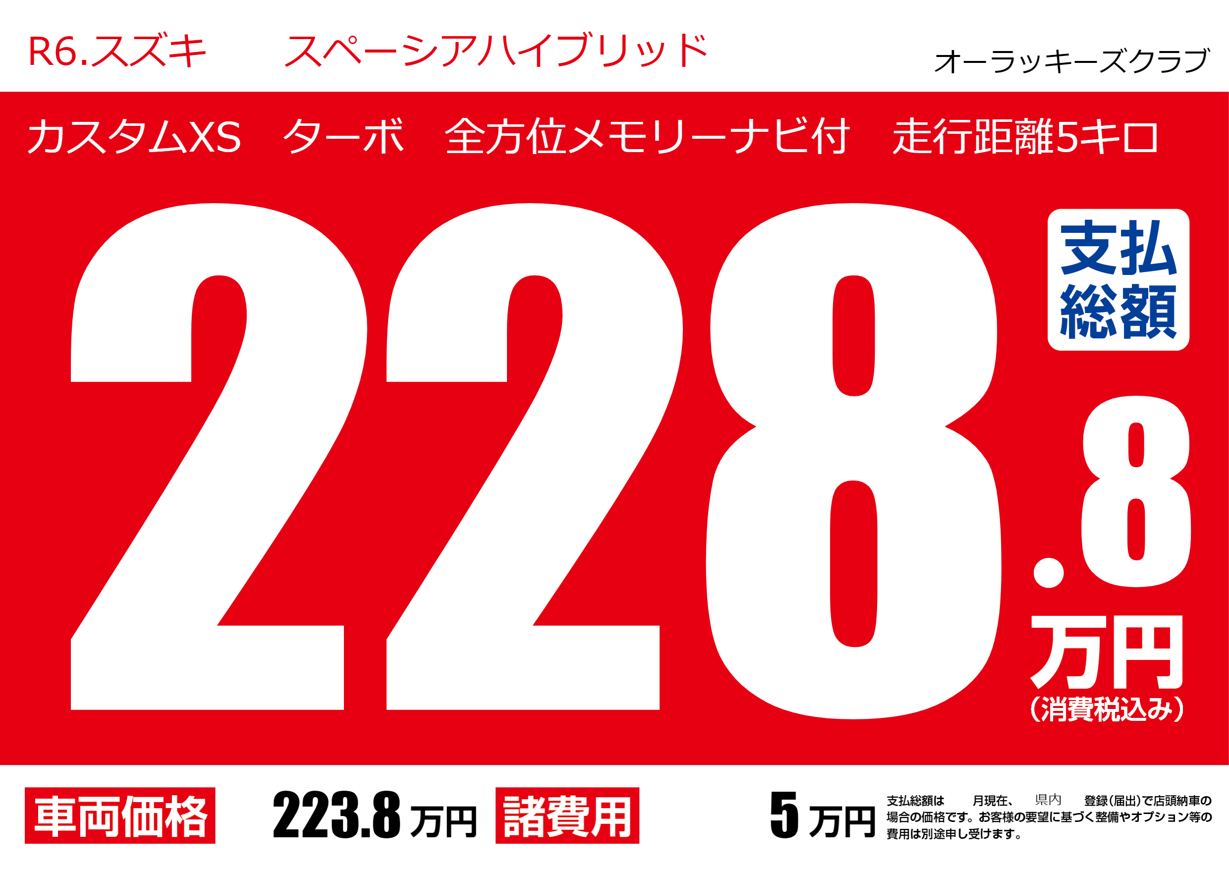 | 車名 | R6.スズキ スペーシアハイブリッド | グレード ミッション 排気量 |
