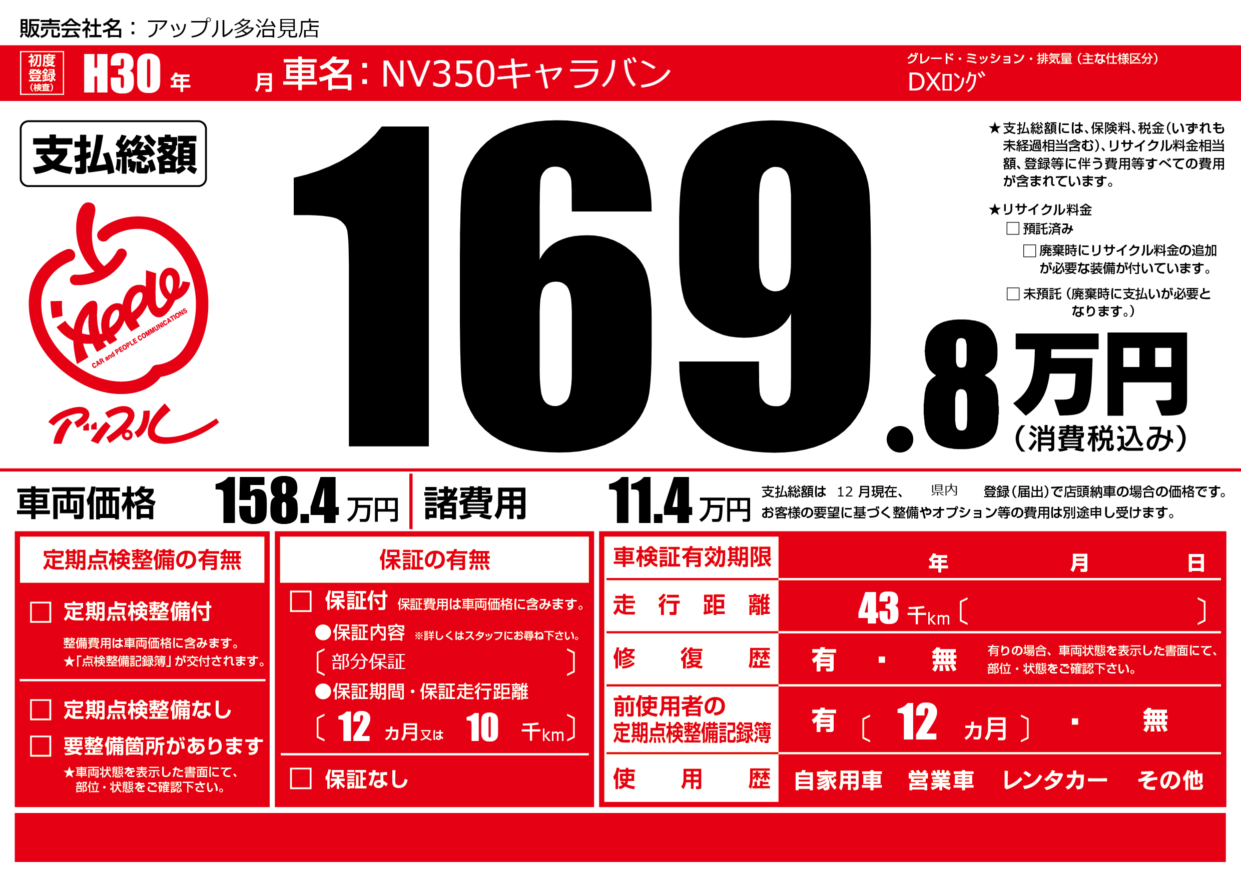 | 走行キロ | 4.3万km | 初年度登録 | H30年---月 |