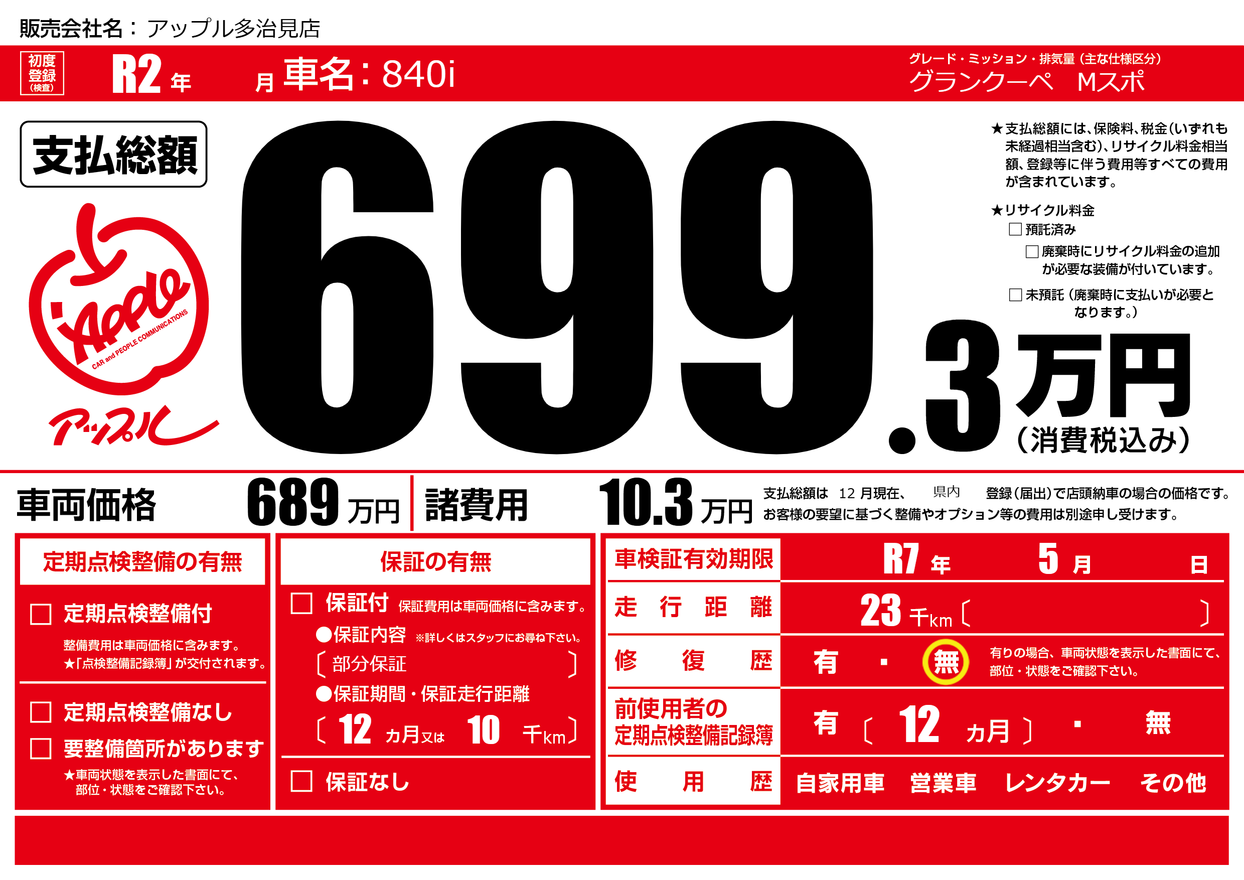| 走行キロ | 2.3万km | 初年度登録 | R2年---月 |