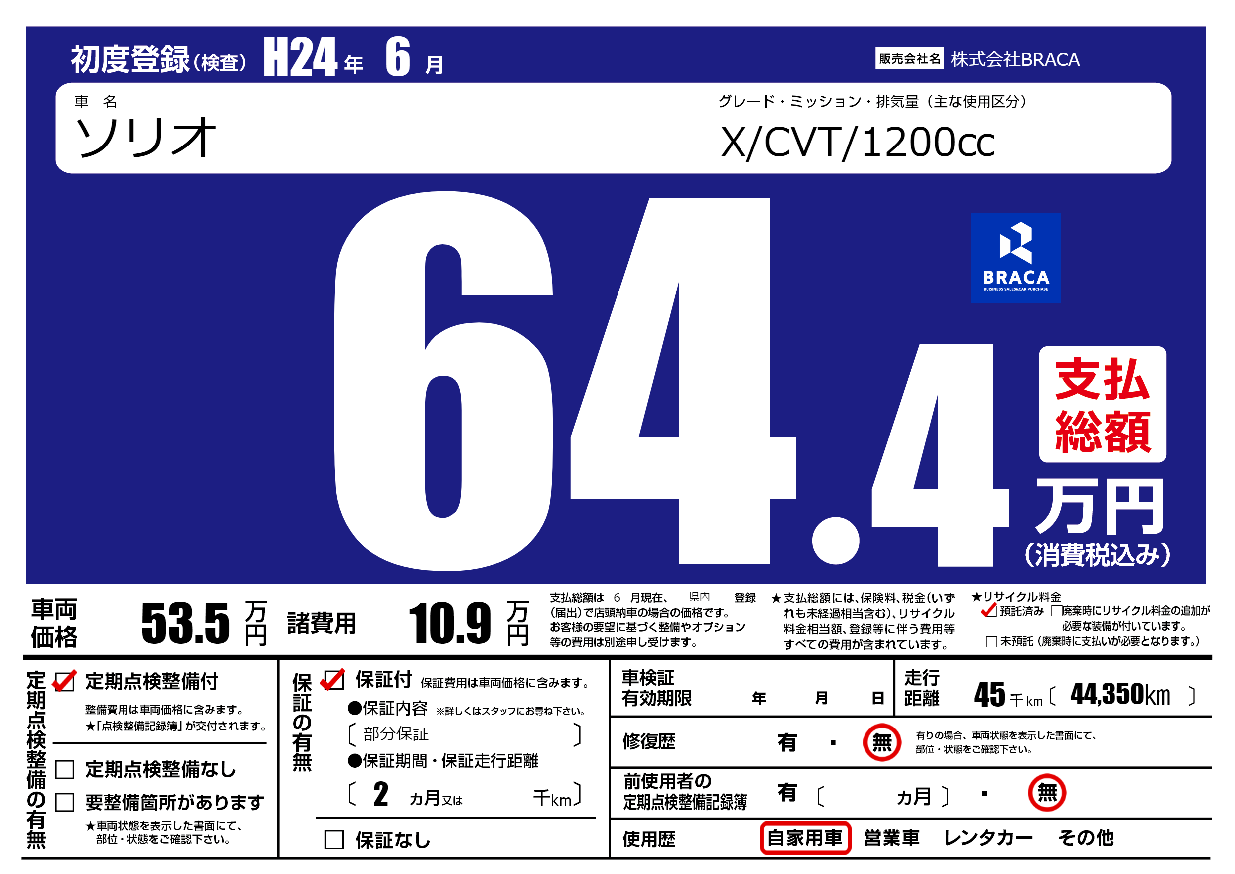 | 走行キロ | 4.5万km | 初年度登録 | H24年6月 |