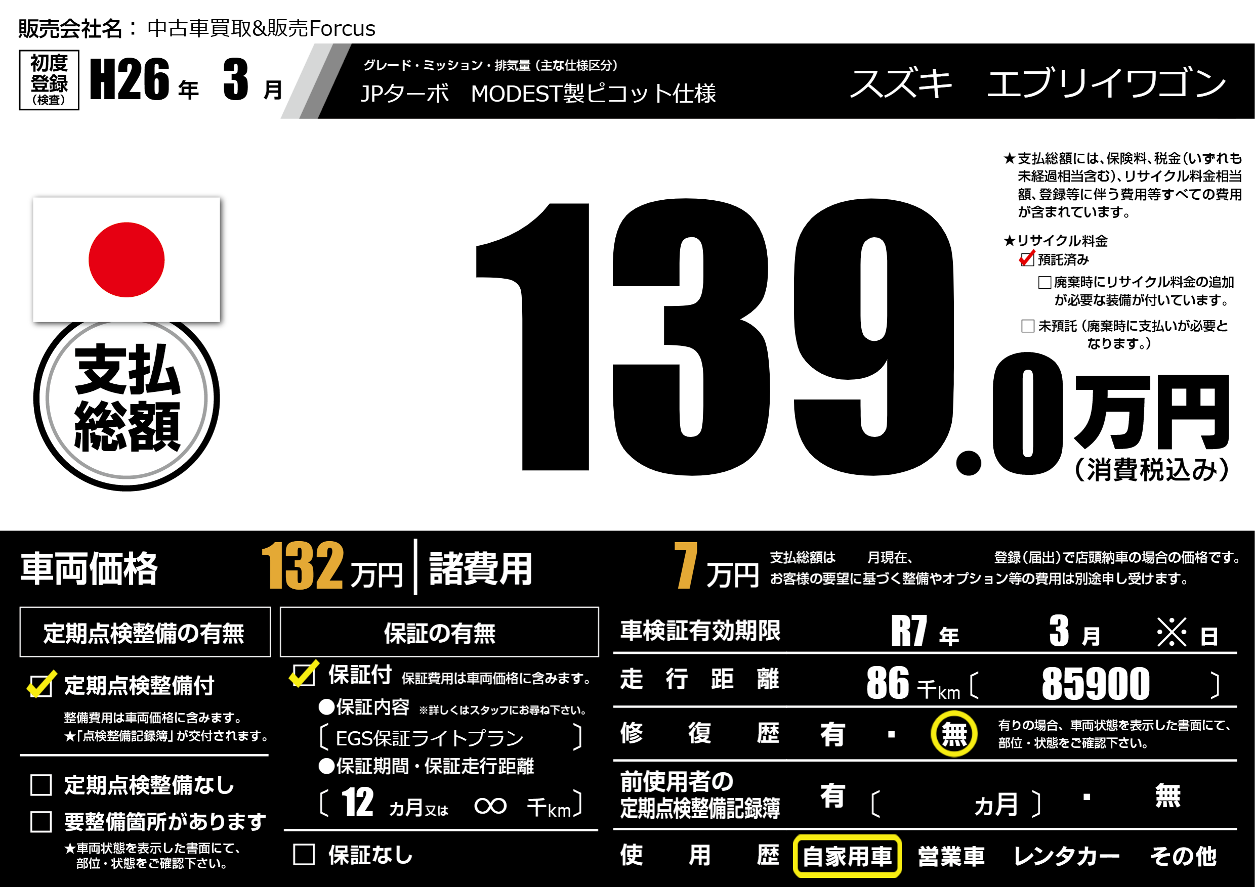| 車名 | スズキ エブリイワゴン | グレード ミッション 排気量 |