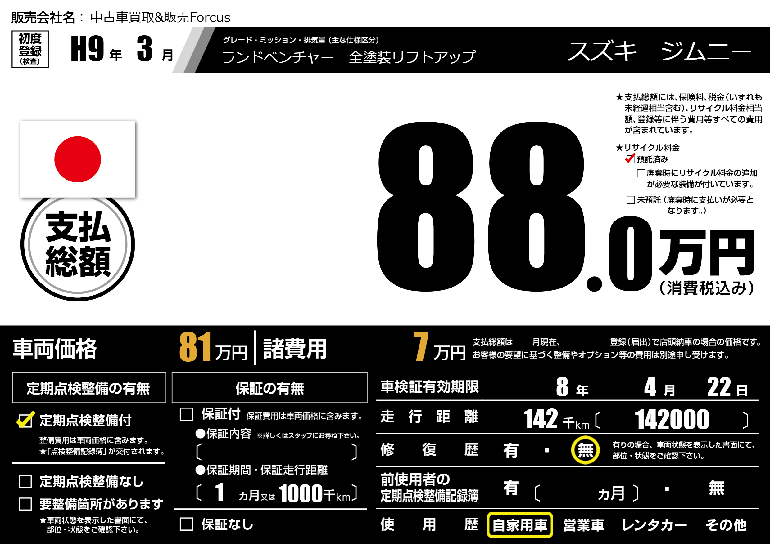 なし | 車検制限 | 8年4月22月 |