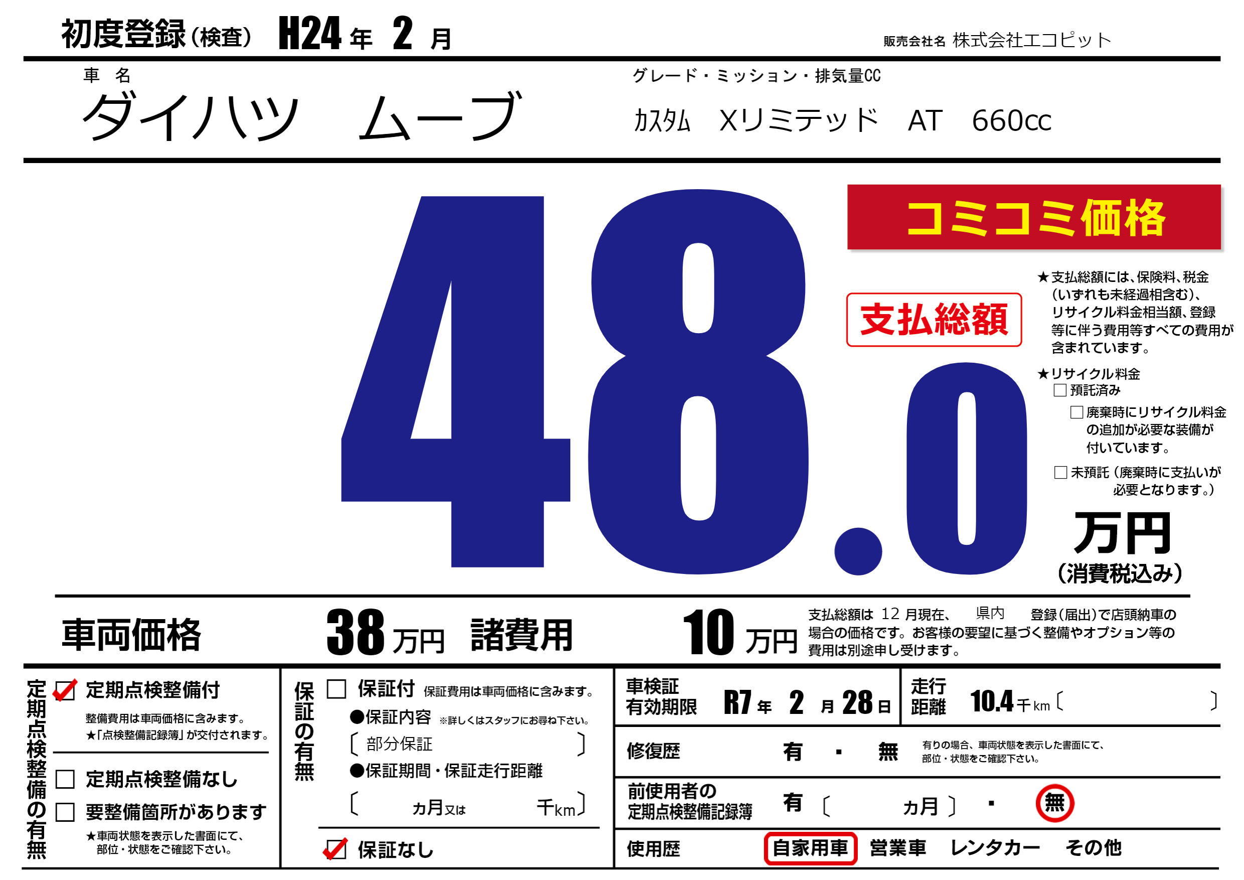 | 定期点検整備 | 定期点検整備あり | ||
