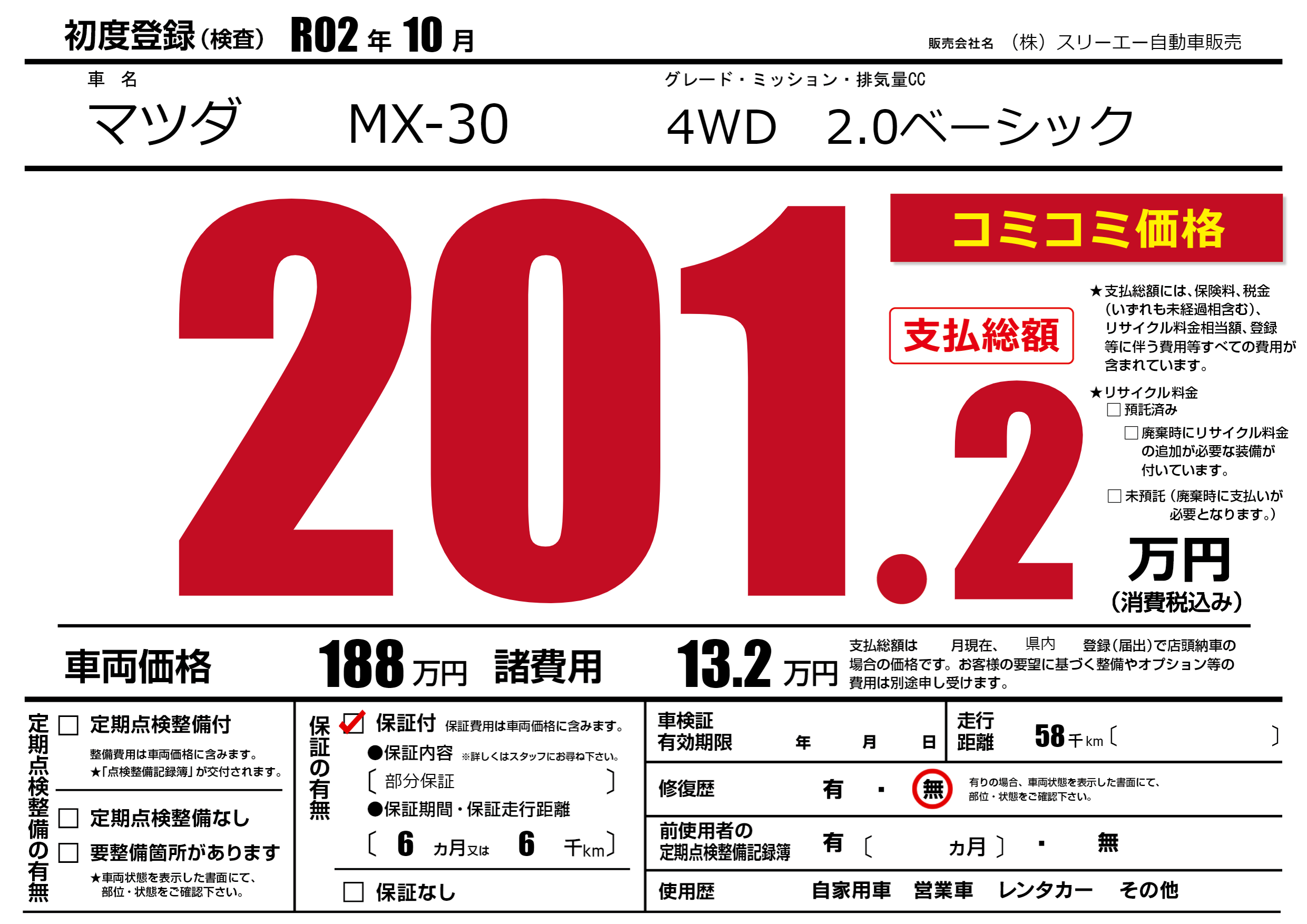 保証付き 保証内容(部分保証) 6ヶ月または(6)千kmまで |