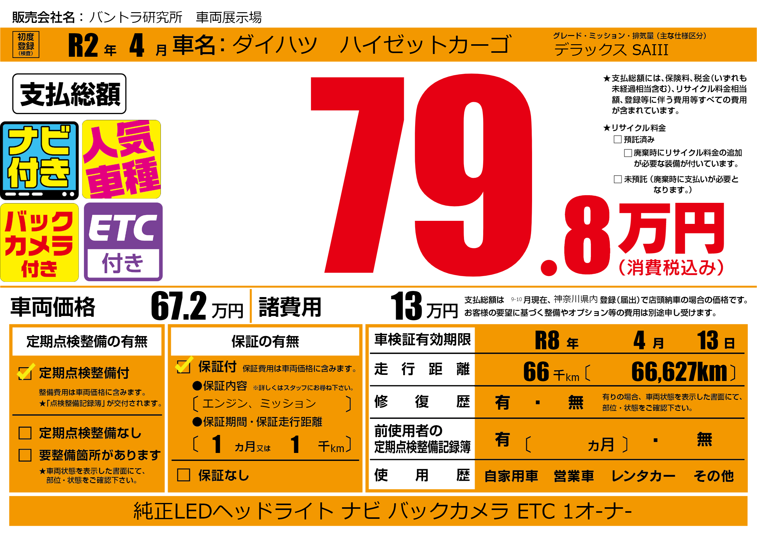 | 車名 | ダイハツ ハイゼットカーゴ | グレード ミッション 排気量 |