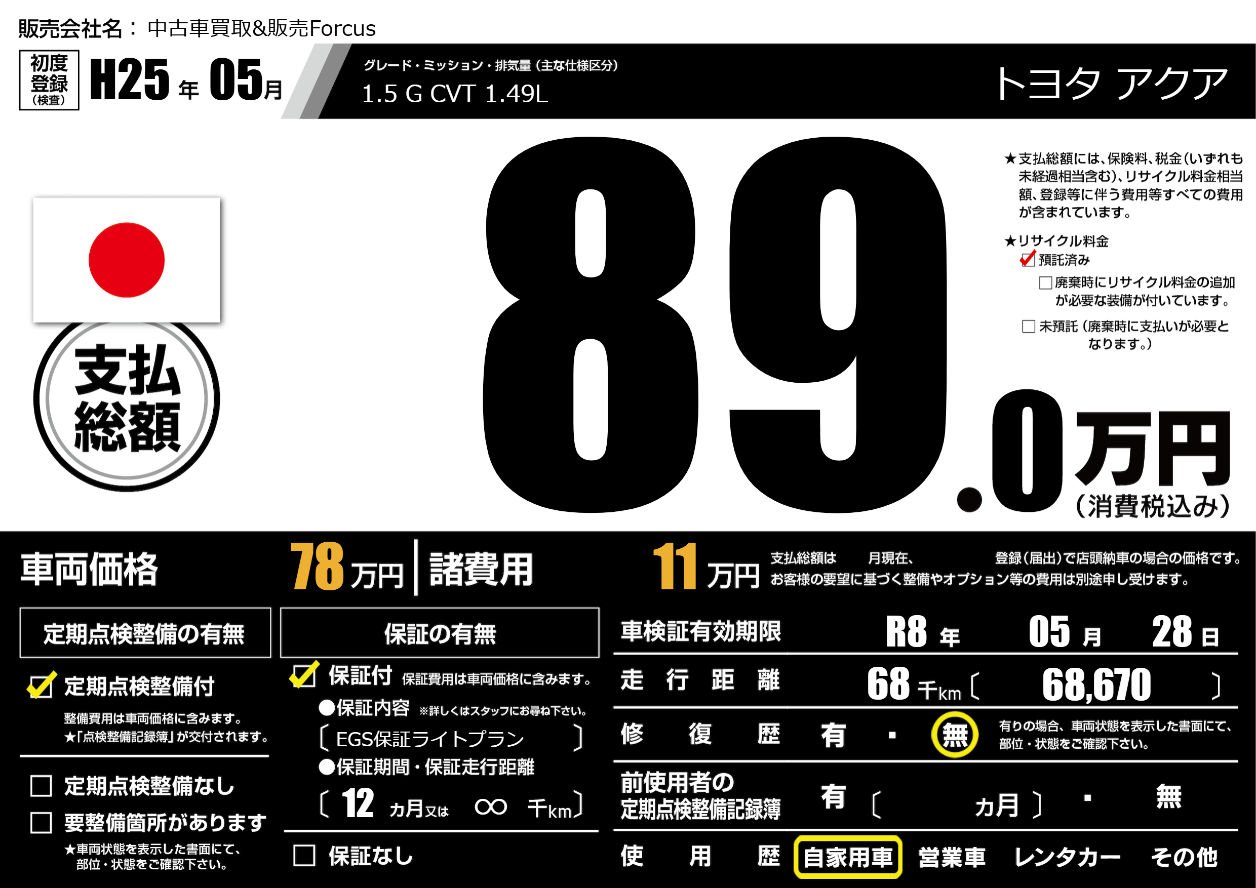 | 走行キロ | 6.8万km | 初年度登録 | H25年05月 |