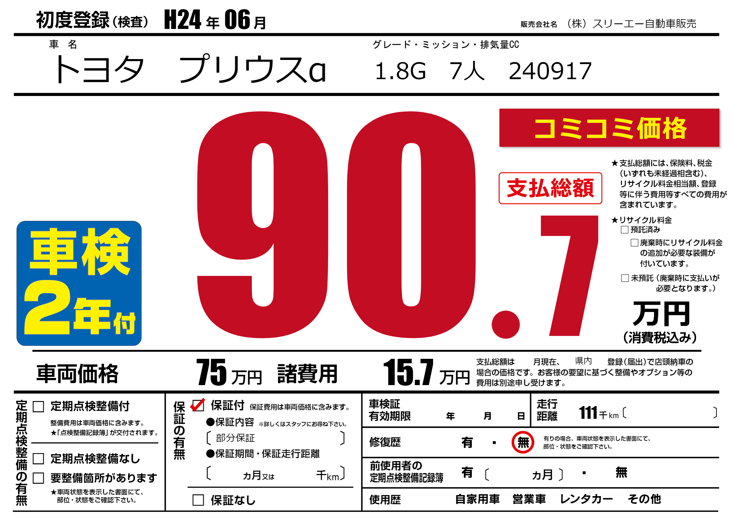 | 車名 | トヨタ プリウスα | グレード ミッション 排気量 |