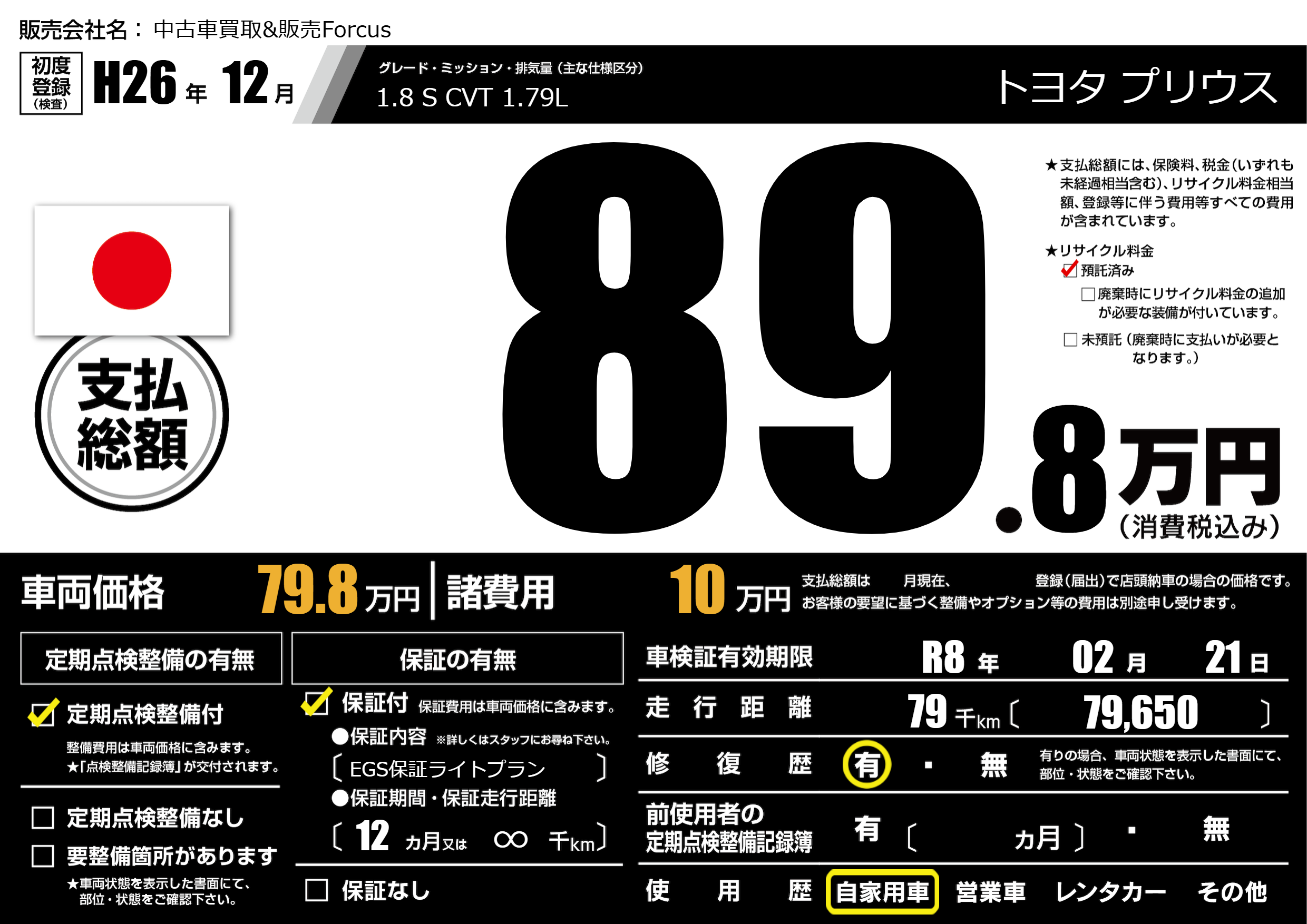| 走行キロ | 7.9万km | 初年度登録 | H26年12月 |