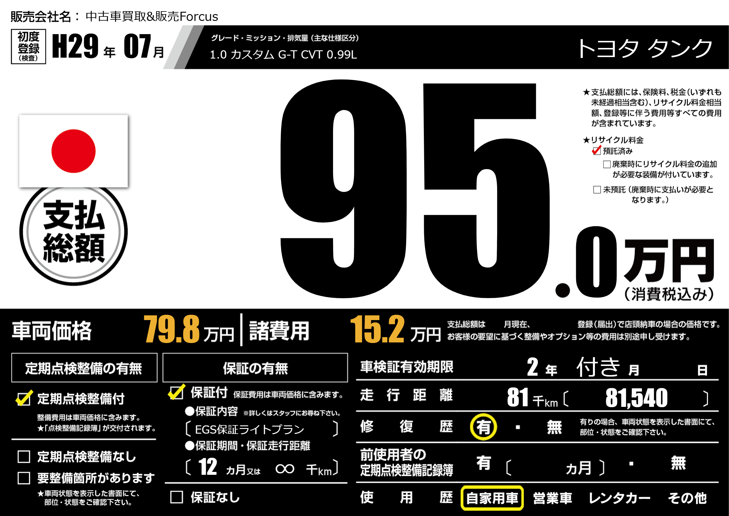 | 車名 | トヨタ タンク | グレード ミッション 排気量 |