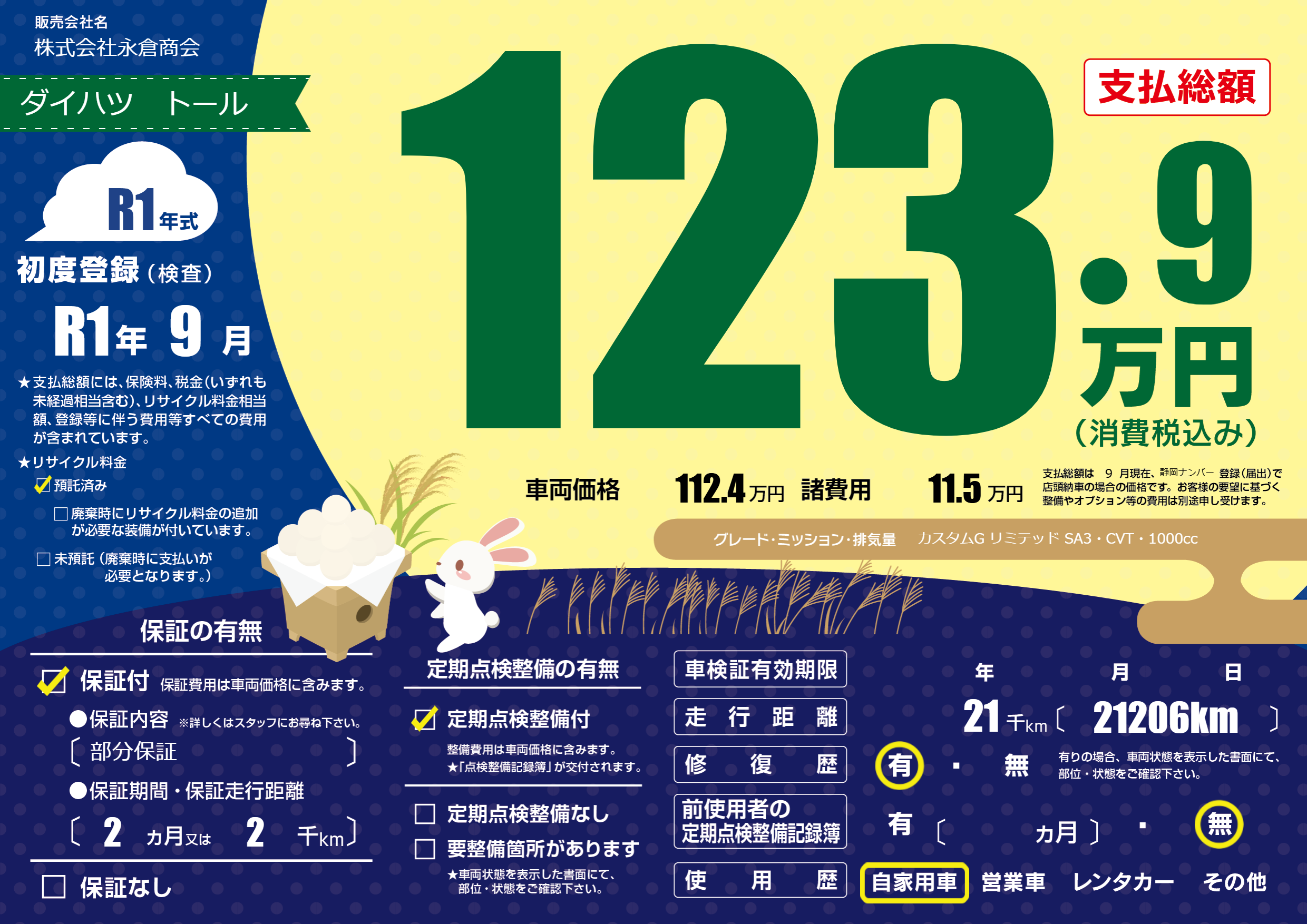 | 車名 | ダイハツ トール | グレード ミッション 排気量 |