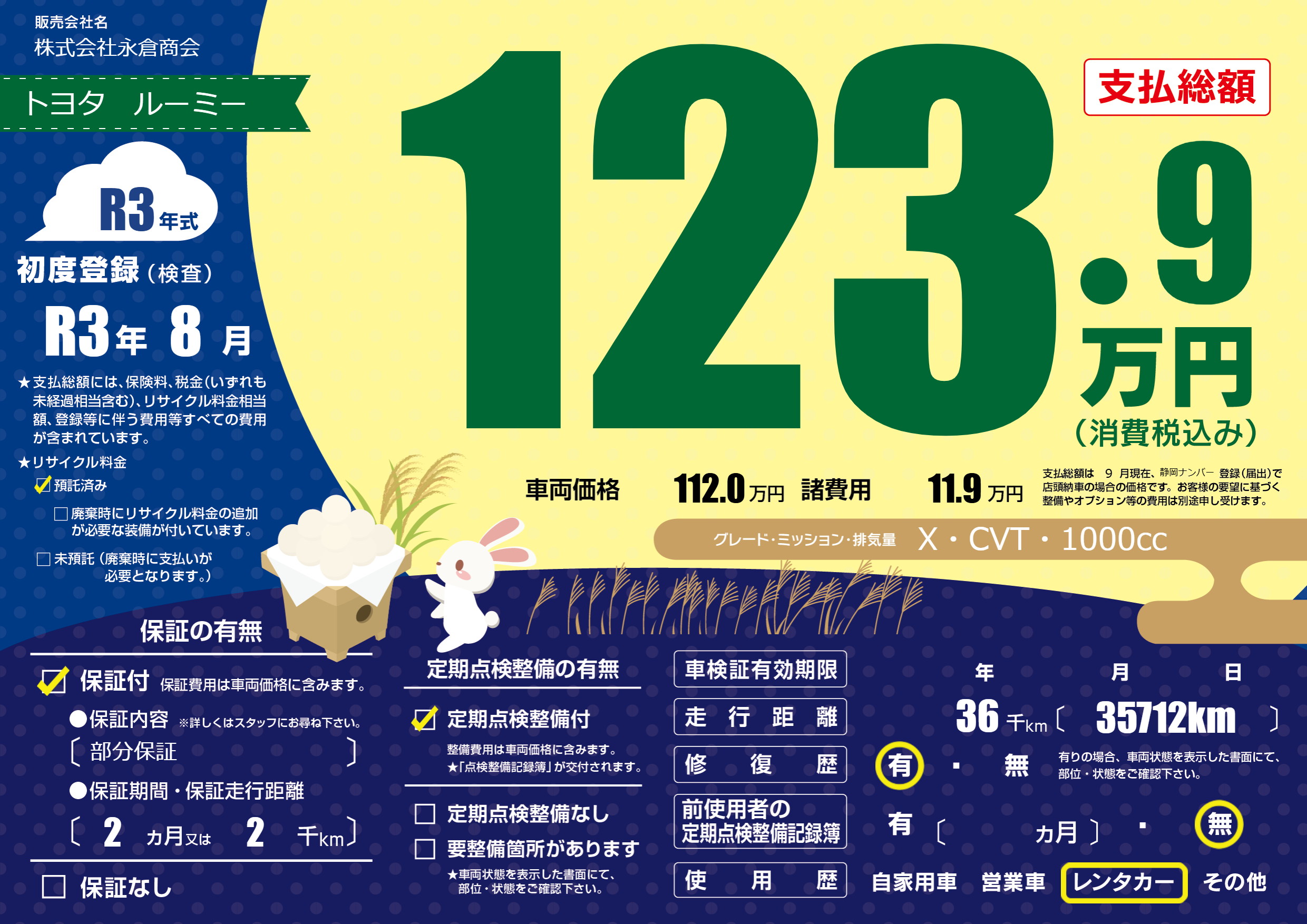 | 走行キロ | 3.6万km | 初年度登録 | R3年8月 |