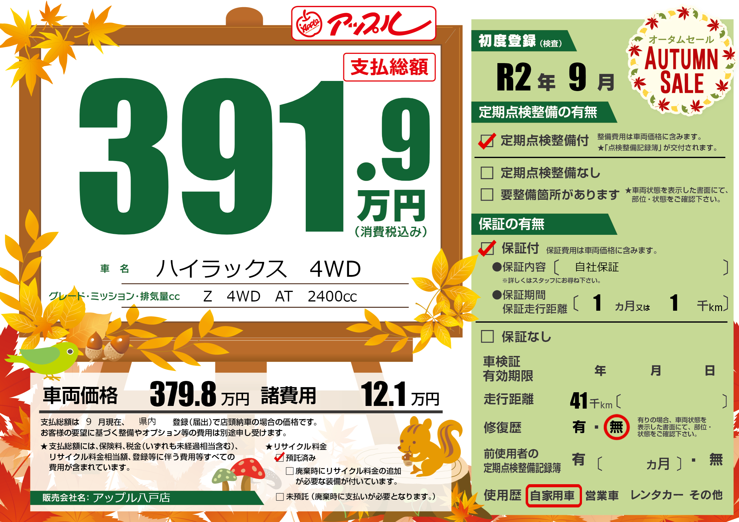| 走行キロ | 4.1万km | 初年度登録 | R2年9月 |