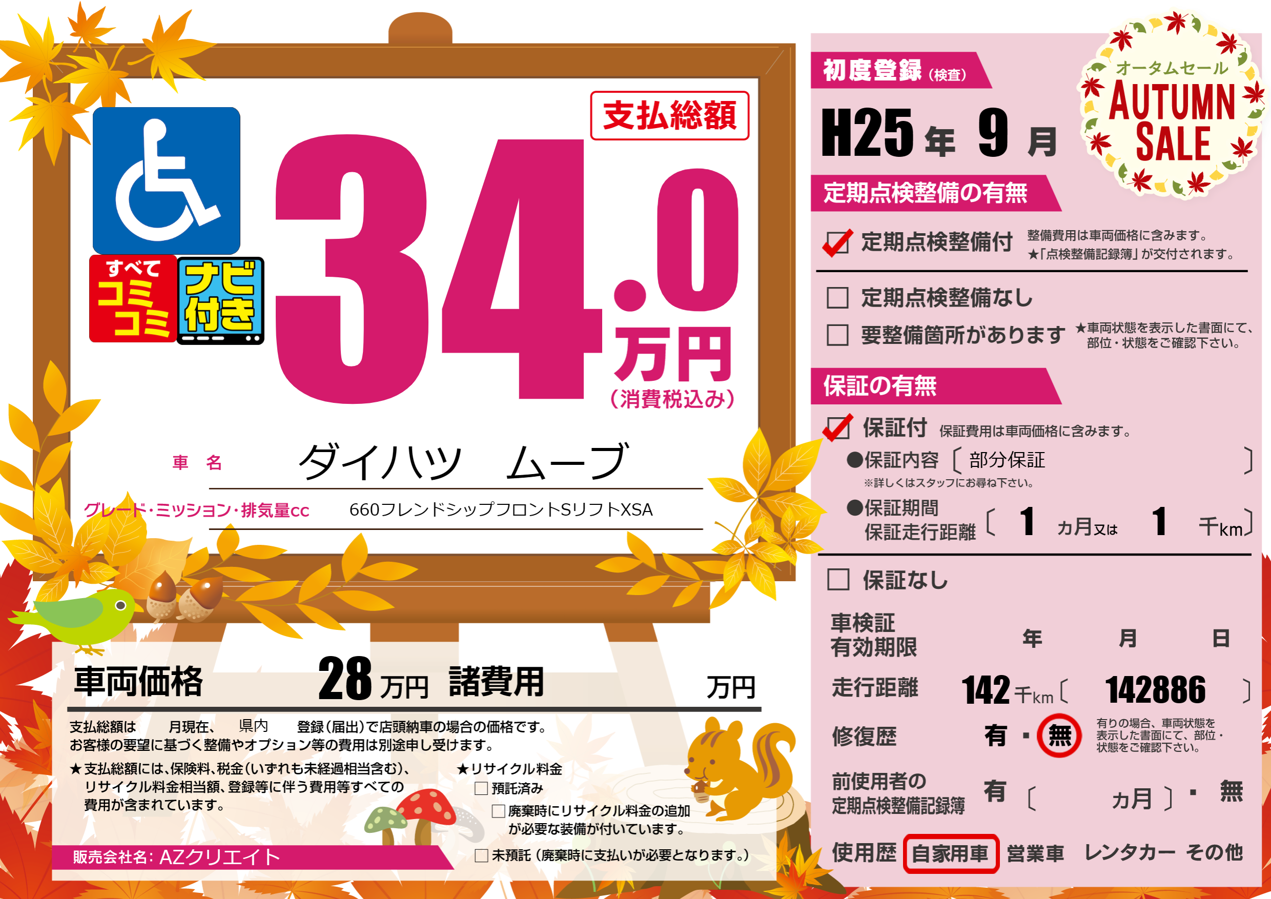 | 走行キロ | 14.2万km | 初年度登録 | H25年9月 |