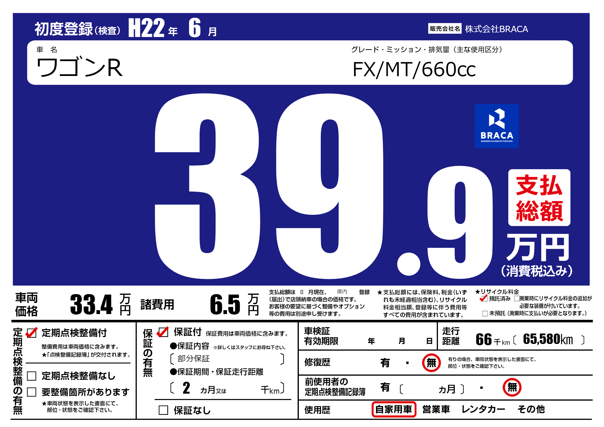 | 走行キロ | 6.6万km | 初年度登録 | H22年6月 |