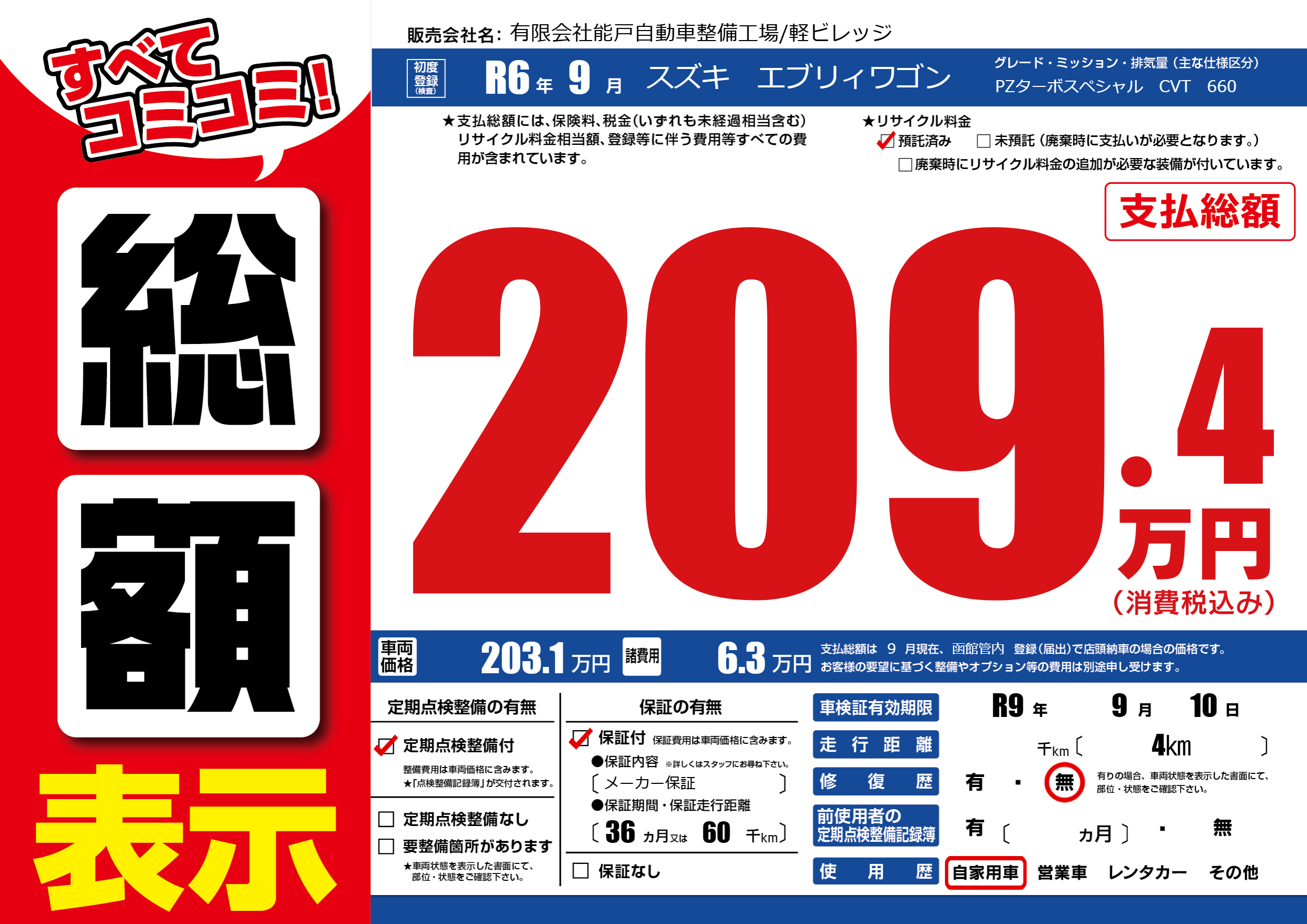 | 車名 | スズキ エブリィワゴン | グレード ミッション 排気量 |