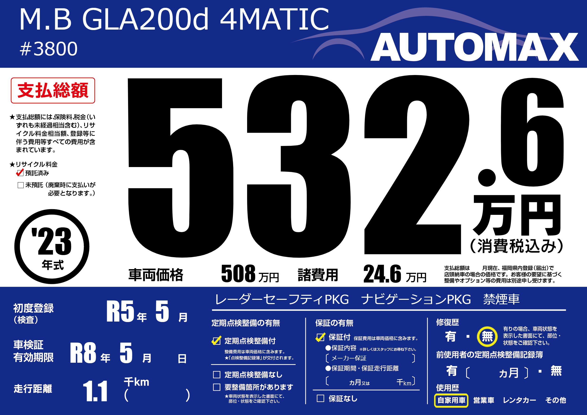 | 車名 | M.B GLA200d 4MATIC | グレード ミッション 排気量 |