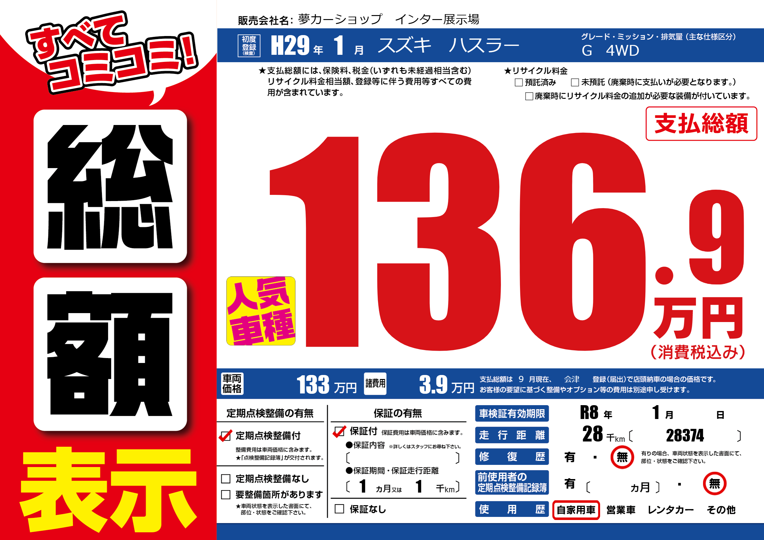 | 車名 | スズキ ハスラー | グレード ミッション 排気量 |