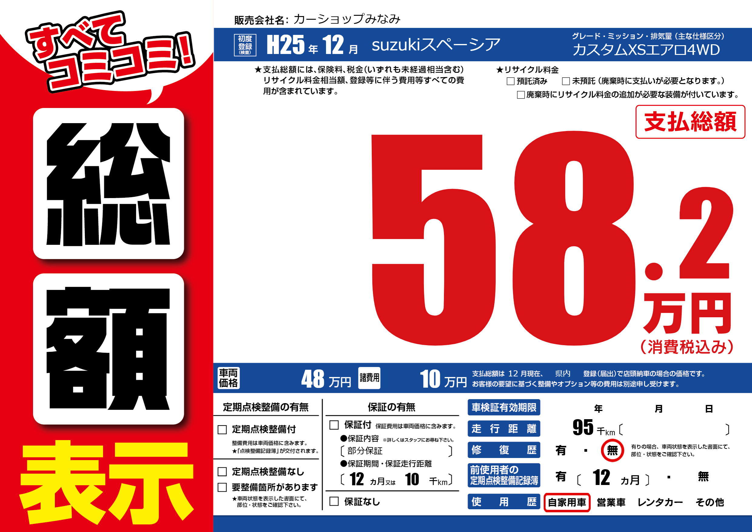 | 車名 | suzukiスペーシア | グレード ミッション 排気量 |
