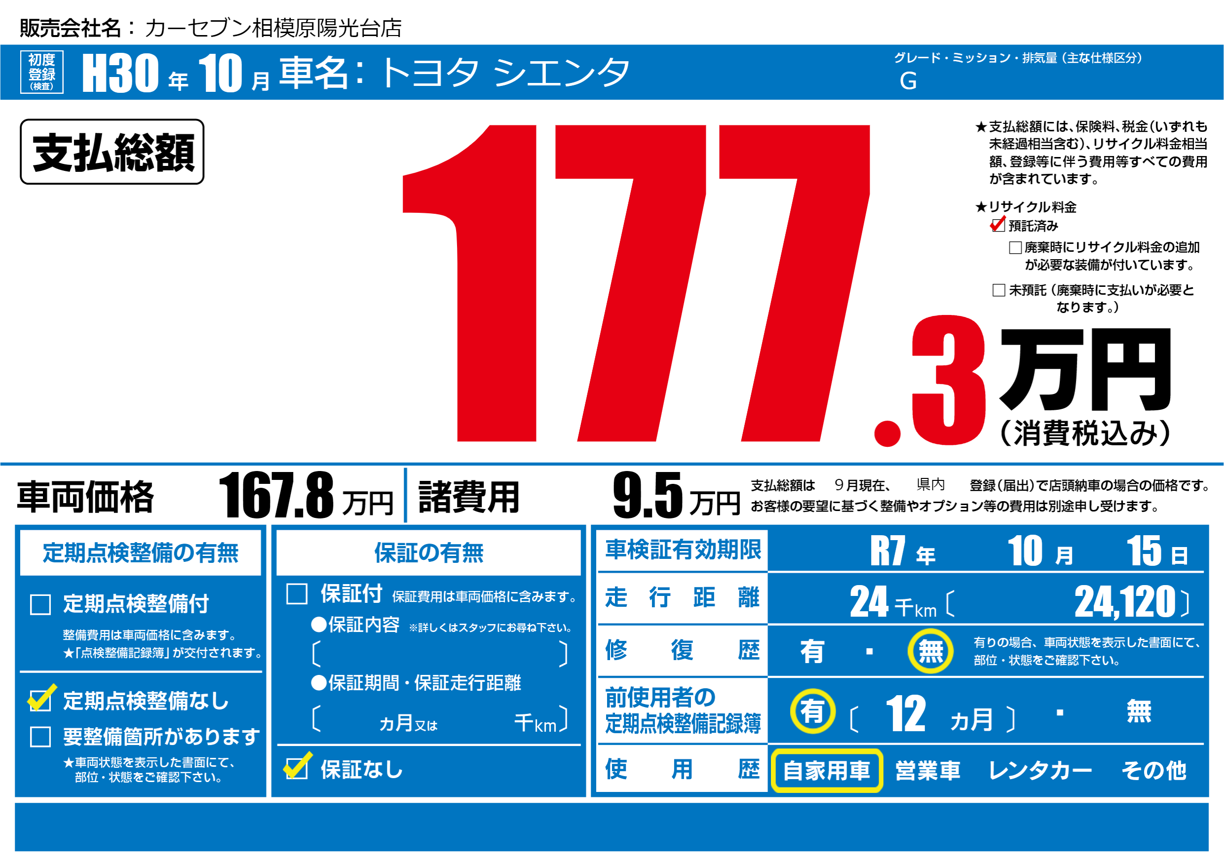 なし | 車検制限 | R7年10月15月 |