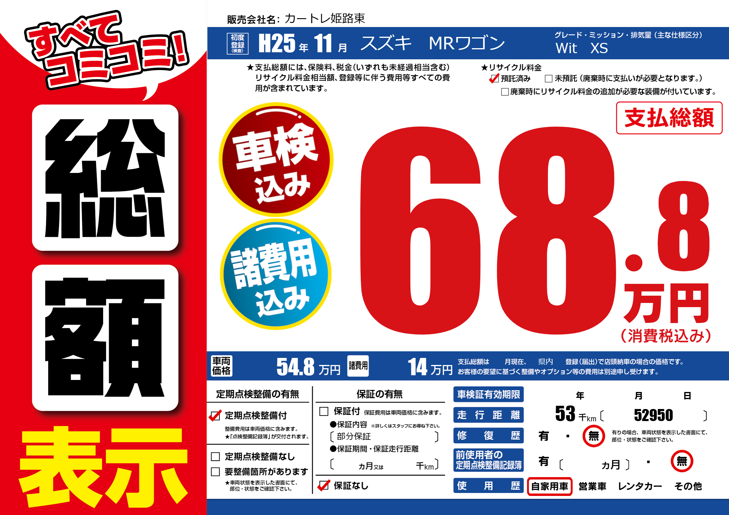 | 車名 | スズキ MRワゴン | グレード ミッション 排気量 |