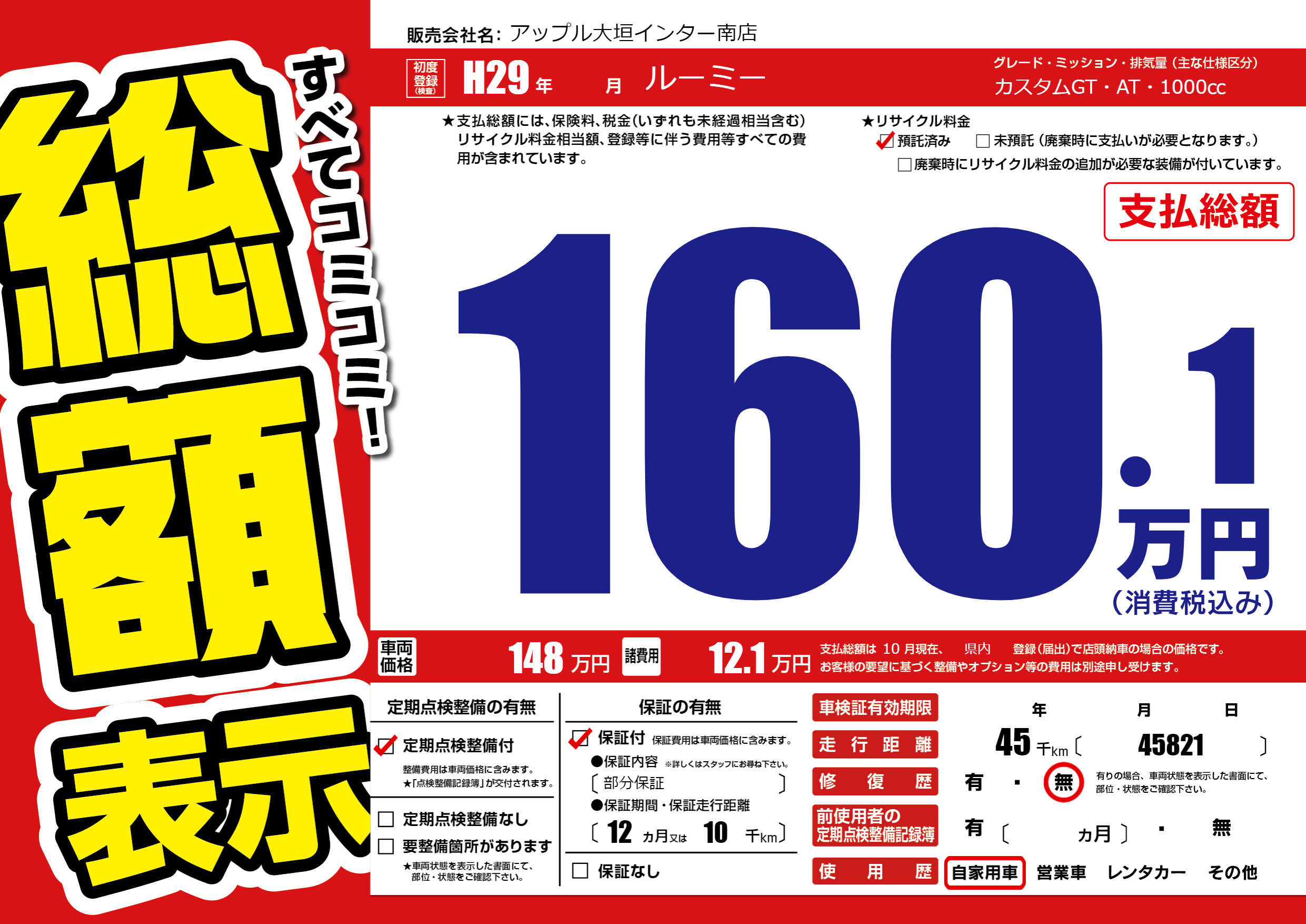| 車名 | ルーミー | グレード ミッション 排気量 |