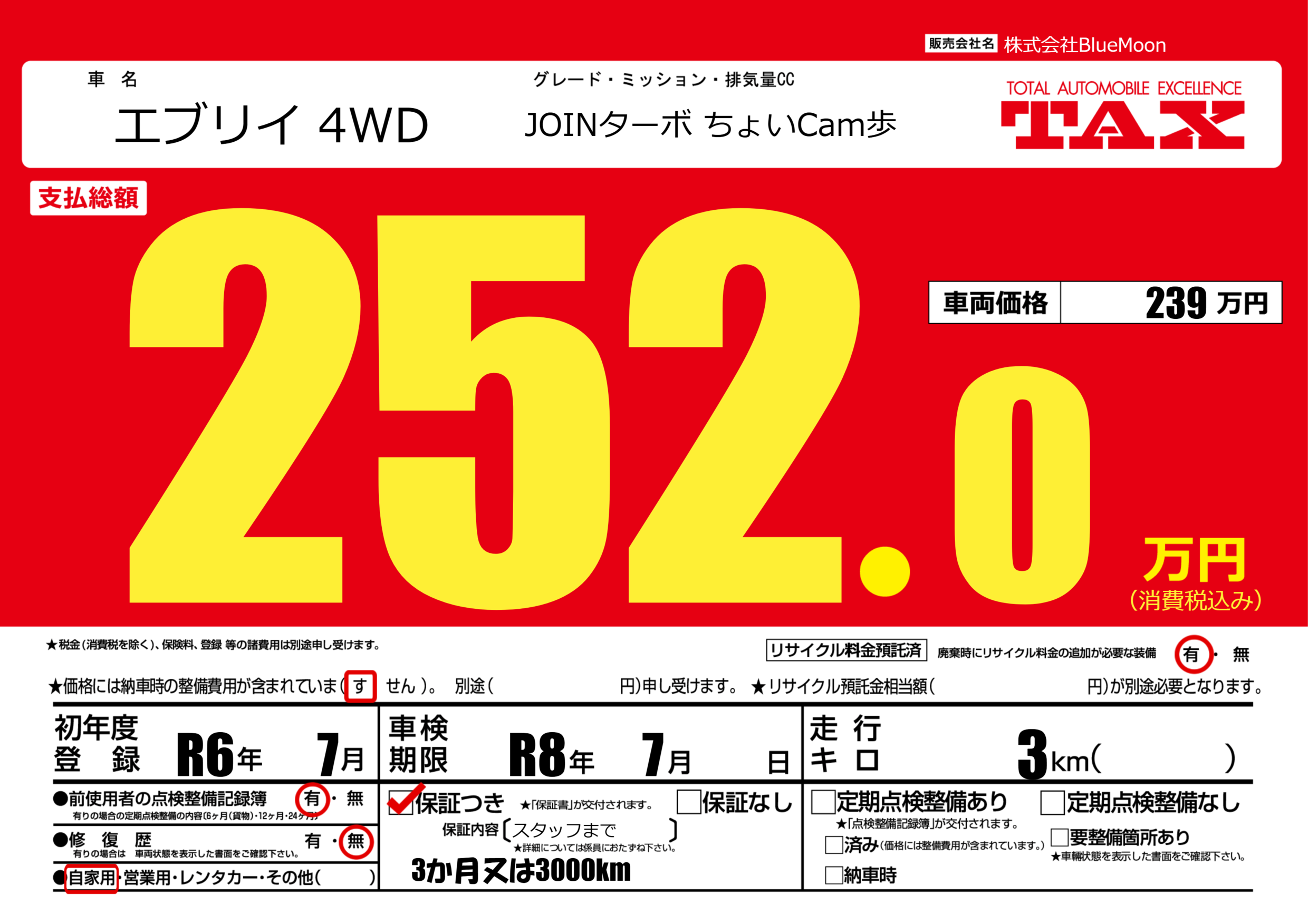 | 走行キロ | 0.3万km | 初年度登録 | R6年7月 |