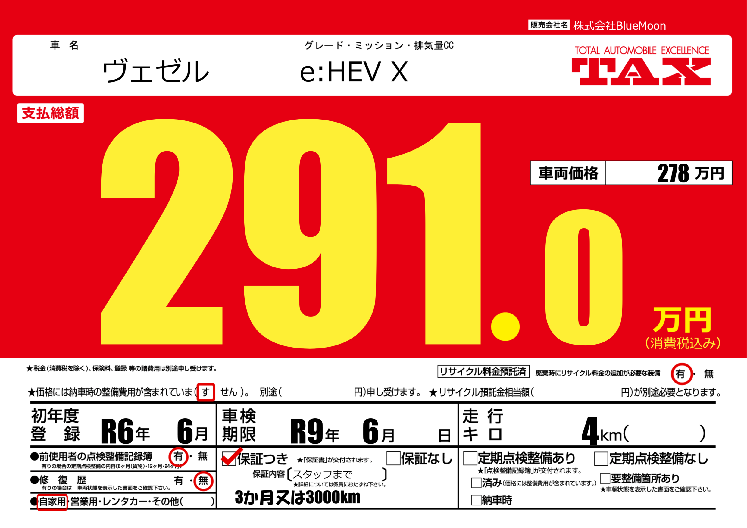 | 走行キロ | 0.4万km | 初年度登録 | R6年6月 |