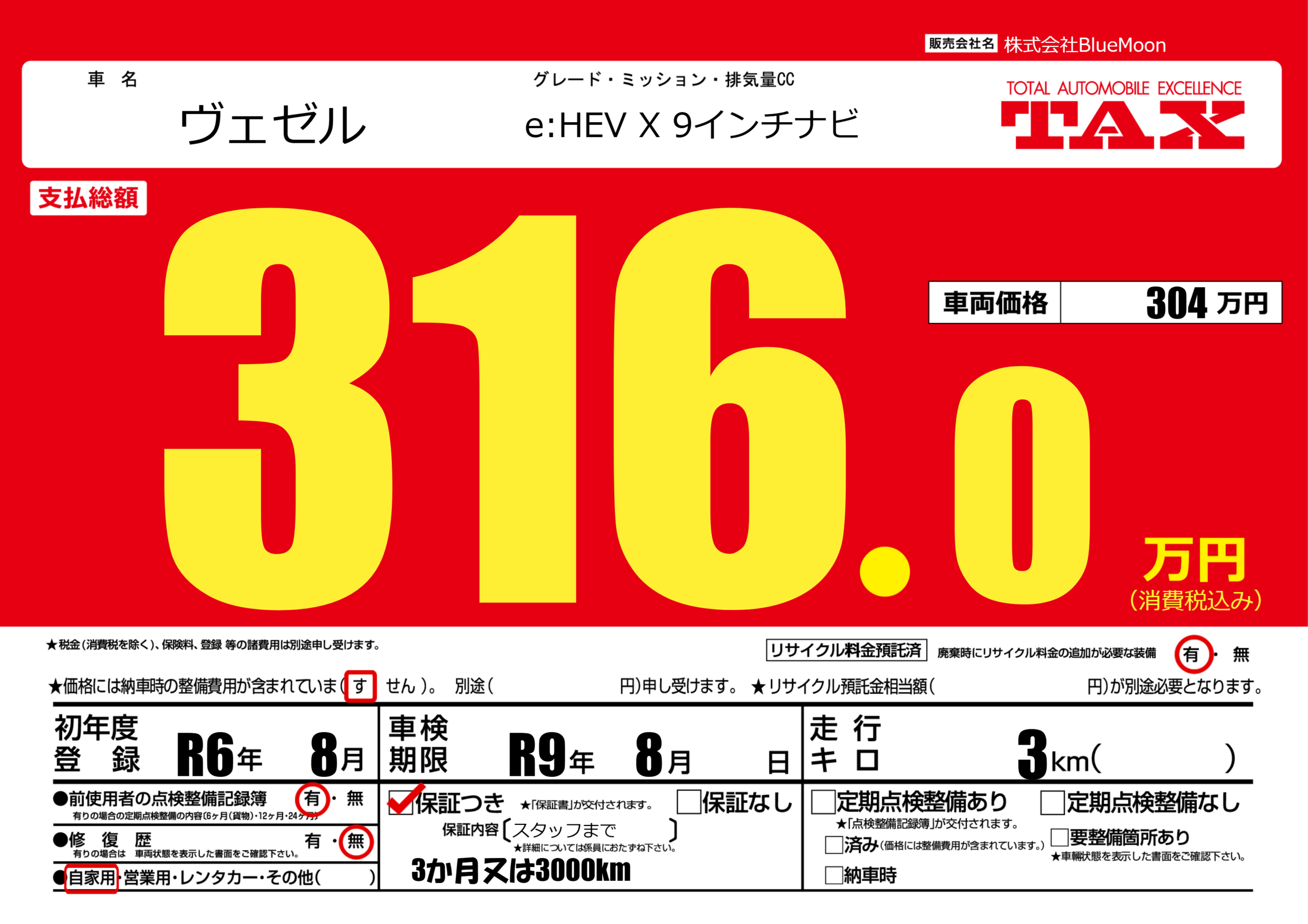 | 走行キロ | 0.3万km | 初年度登録 | R6年8月 |