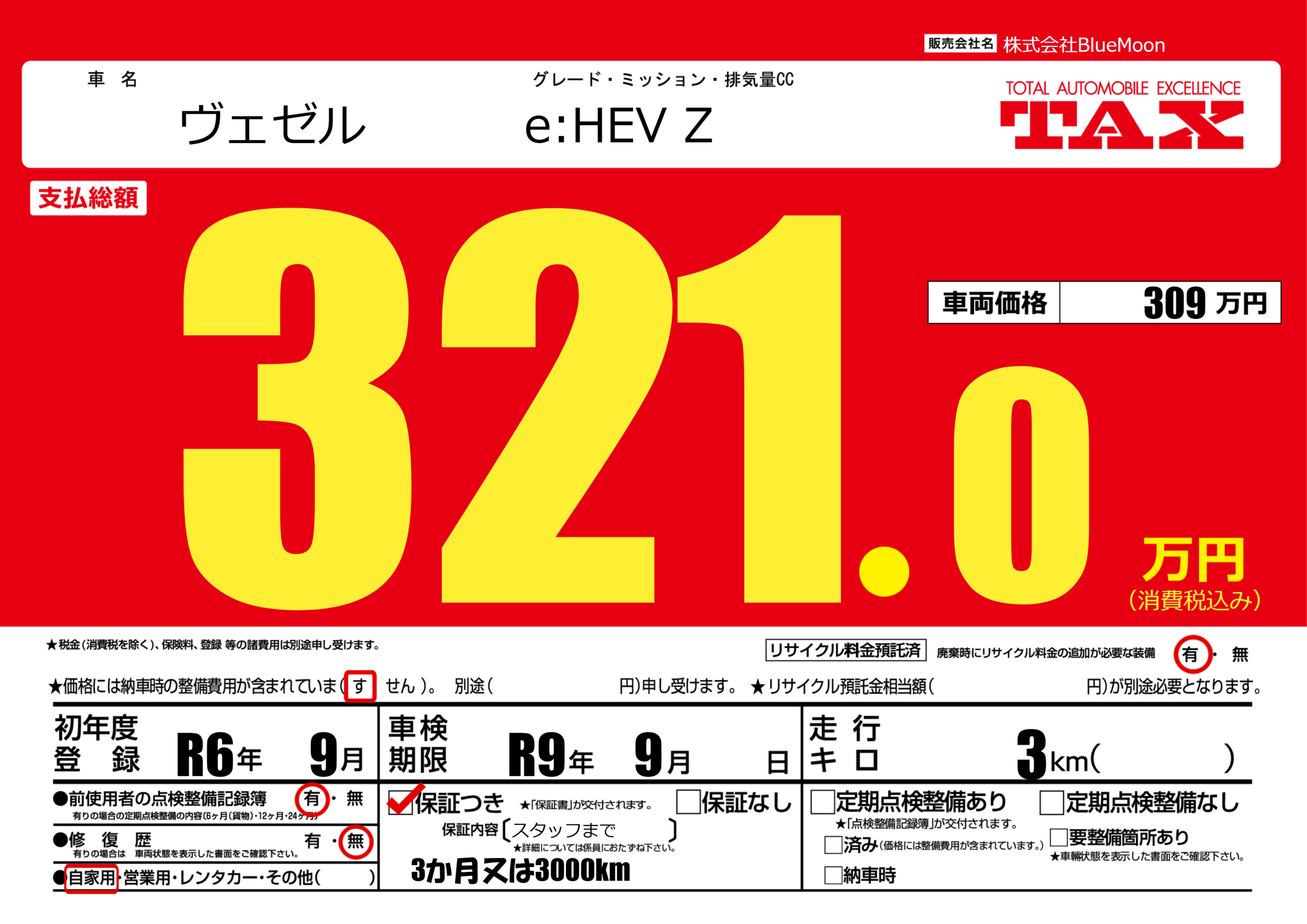 | 走行キロ | 0.3万km | 初年度登録 | R6年9月 |