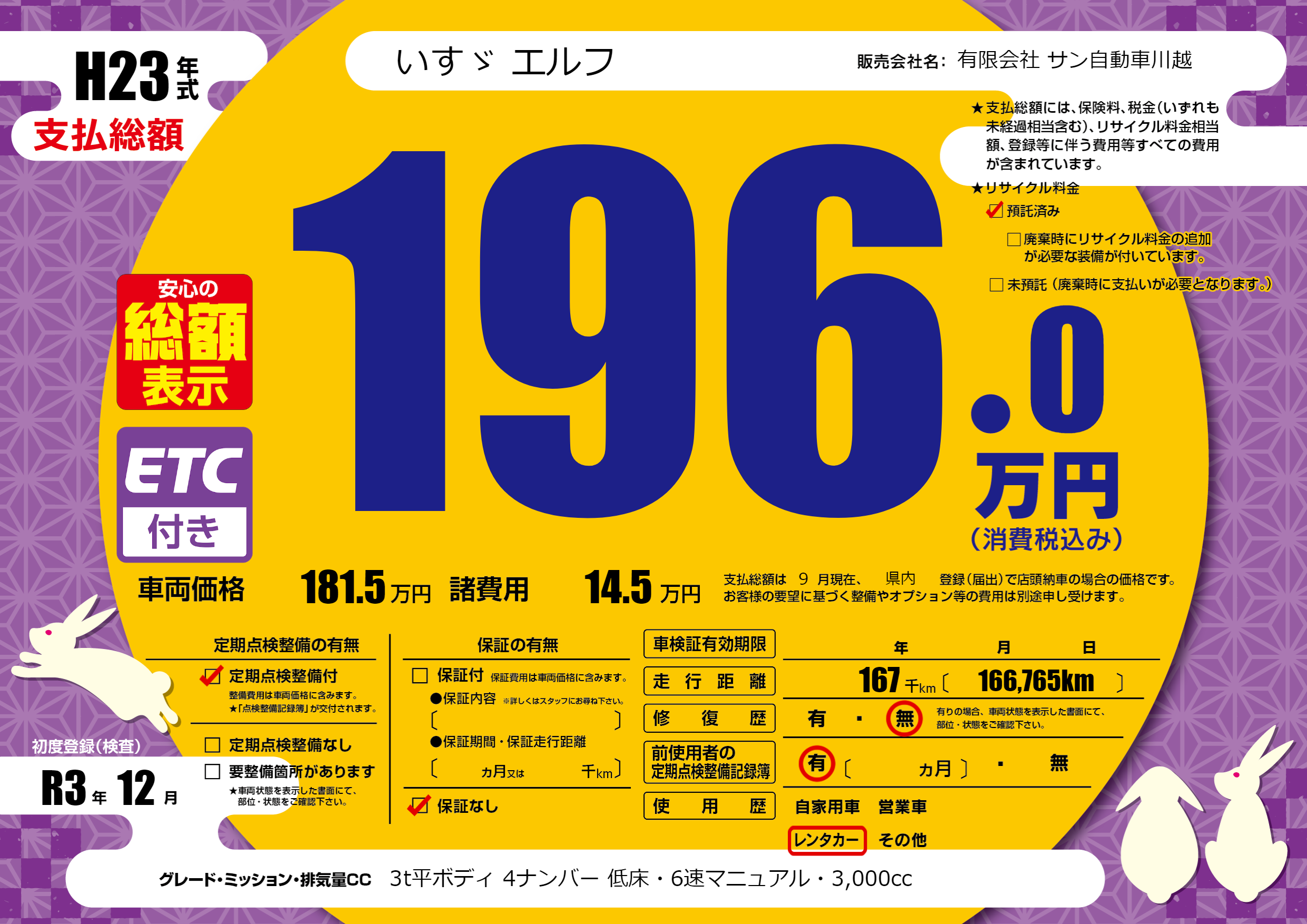 | 車名 | いすゞ エルフ | グレード ミッション 排気量 |