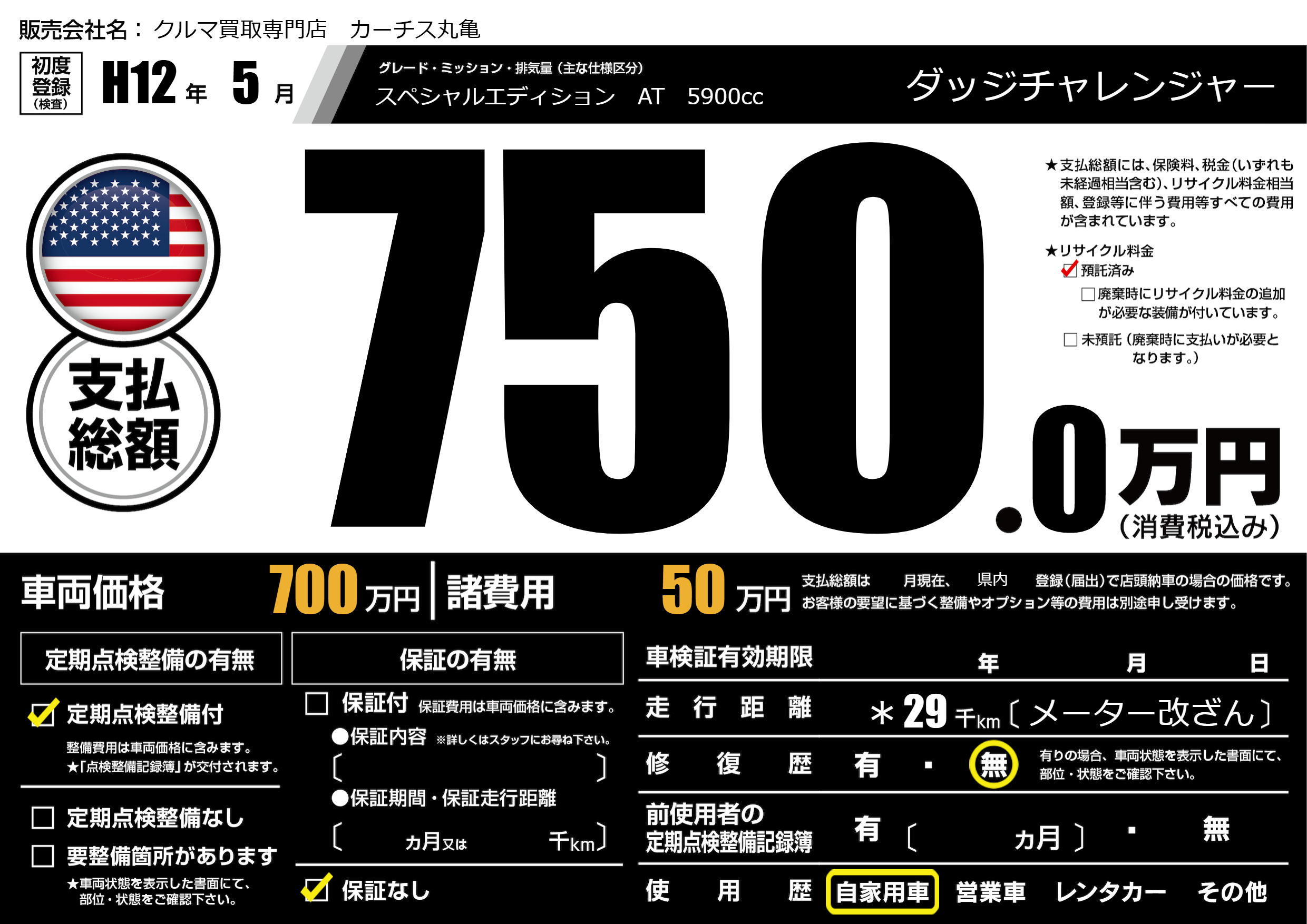 | 車名 | ダッジチャレンジャー | グレード ミッション 排気量 |