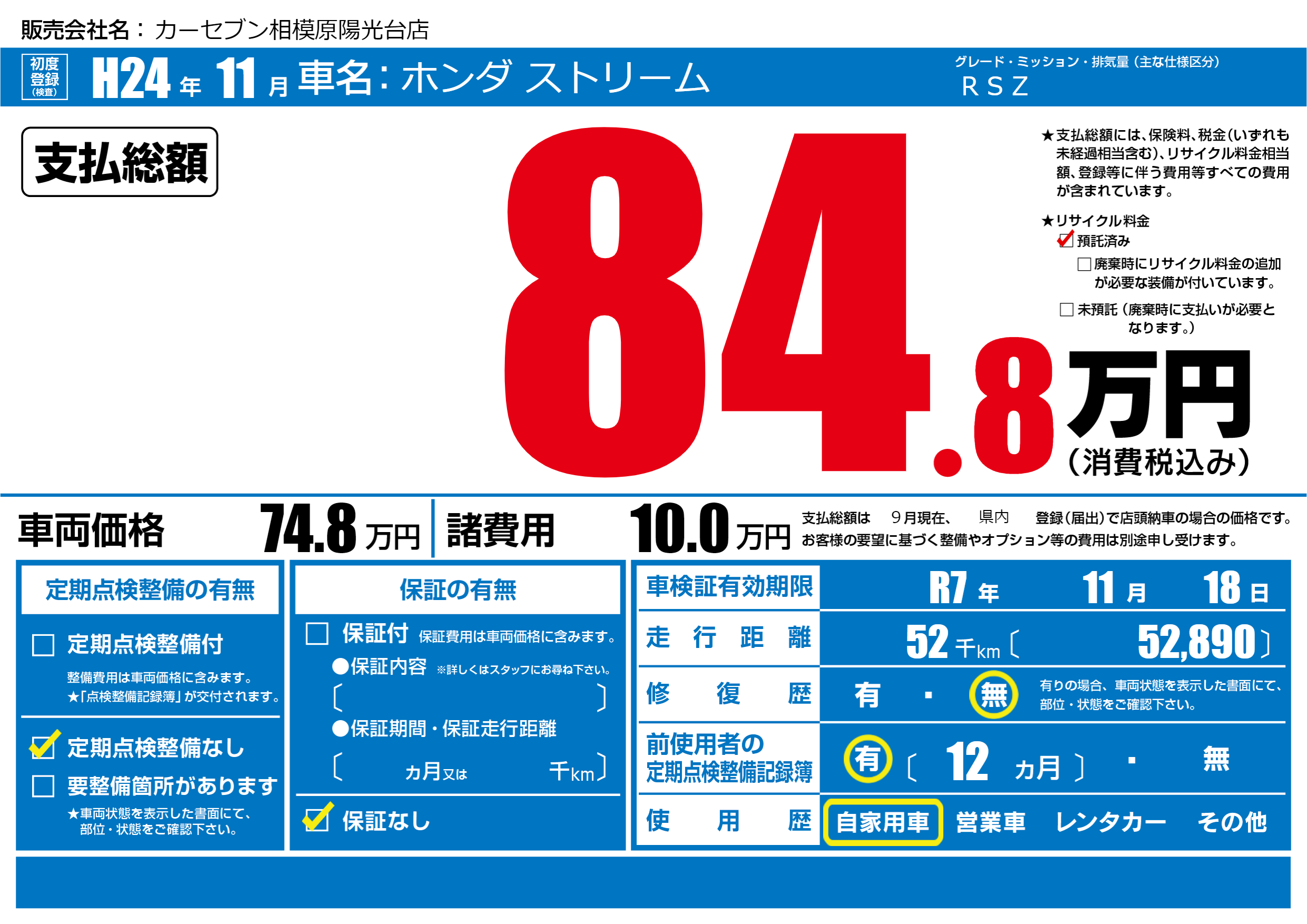 | 走行キロ | 5.2万km | 初年度登録 | H24年11月 |