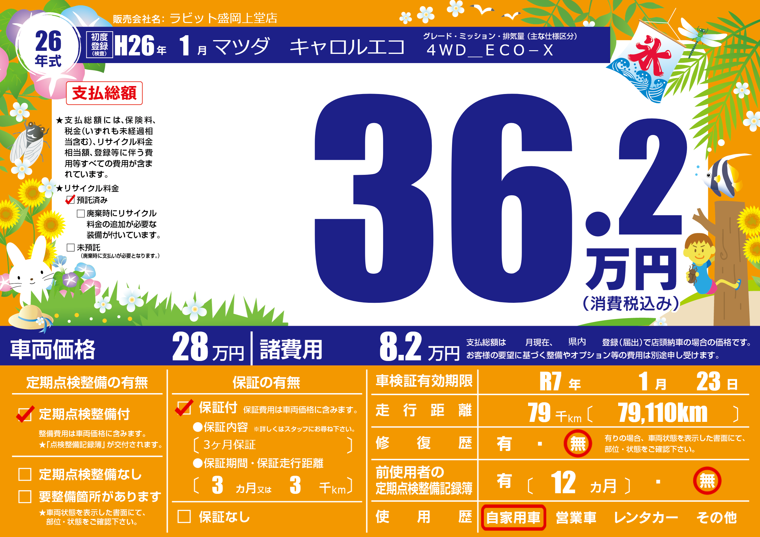 | 走行キロ | 7.9万km | 初年度登録 | H26年1月 |