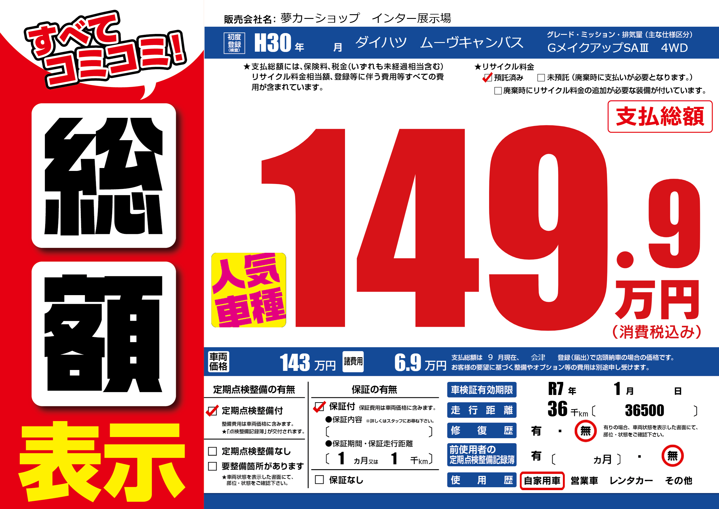 | 走行キロ | 3.6万km | 初年度登録 | H30年---月 |
