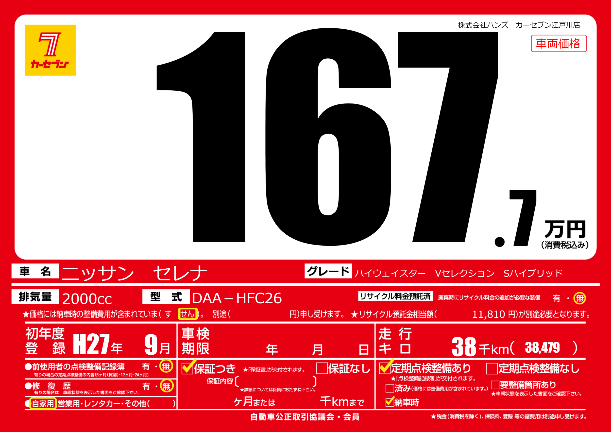 | 車名 | ニッサン セレナ | グレード ミッション 排気量 |