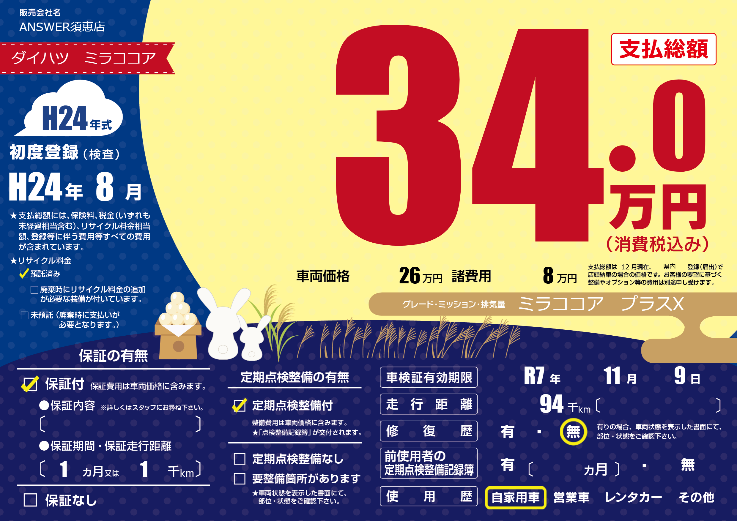 | 車名 | ダイハツ ミラココア | グレード ミッション 排気量 |