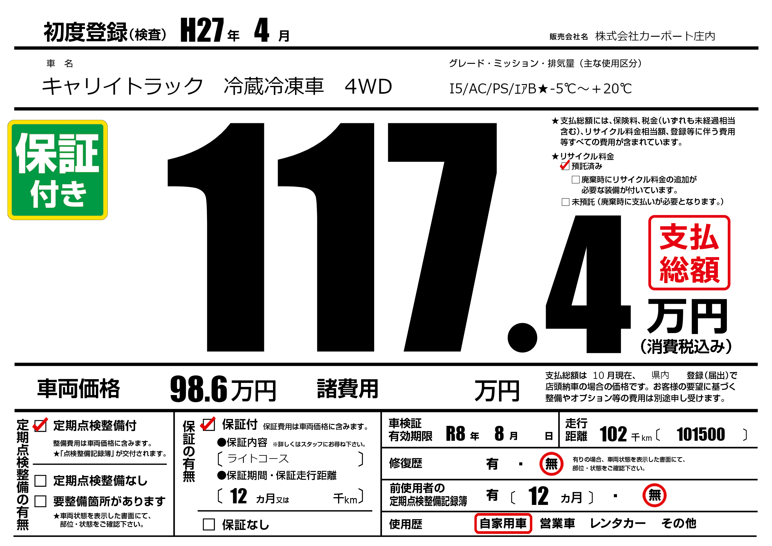 | 車名 | キャリイトラック 冷蔵冷凍車 4WD | グレード ミッション 排気量 |