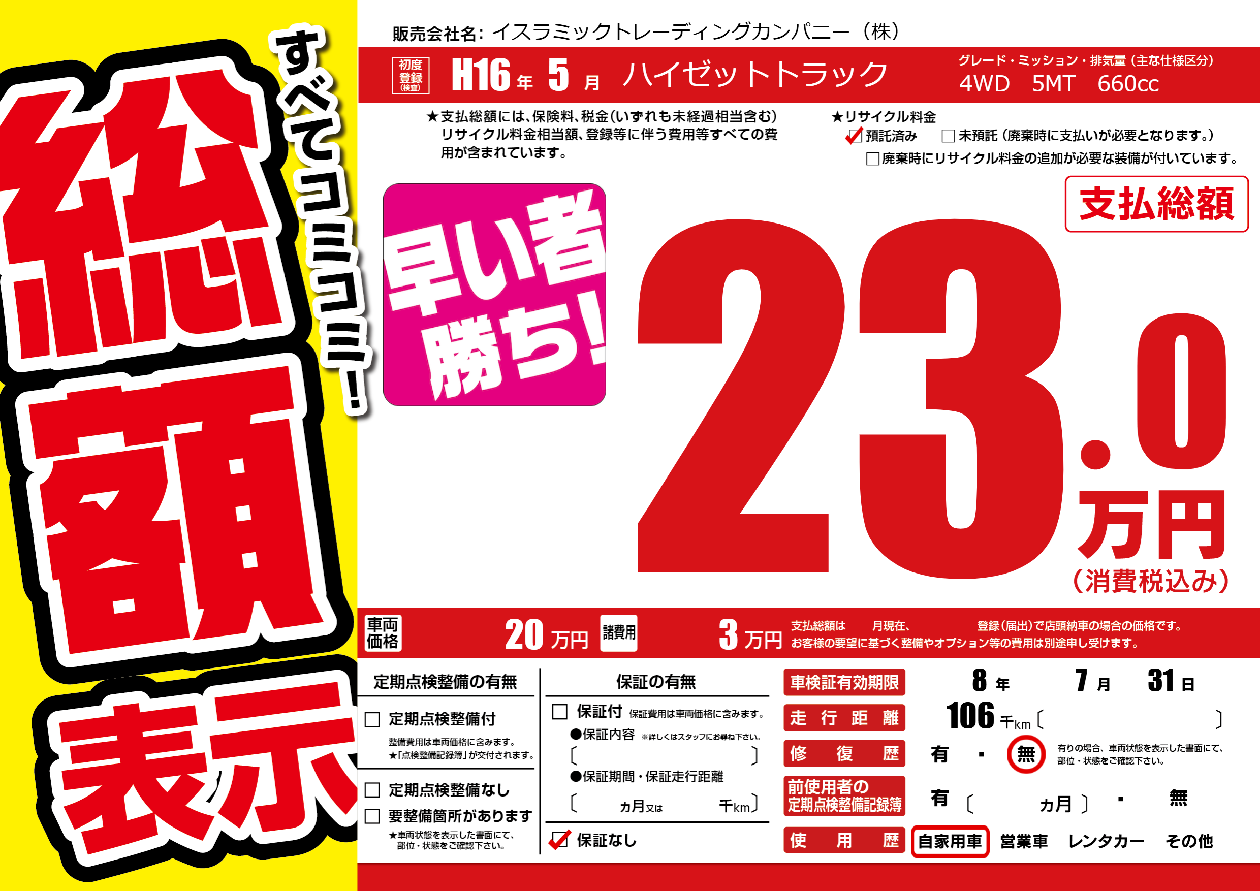 | 走行キロ | 10.6万km | 初年度登録 | H16年5月 |