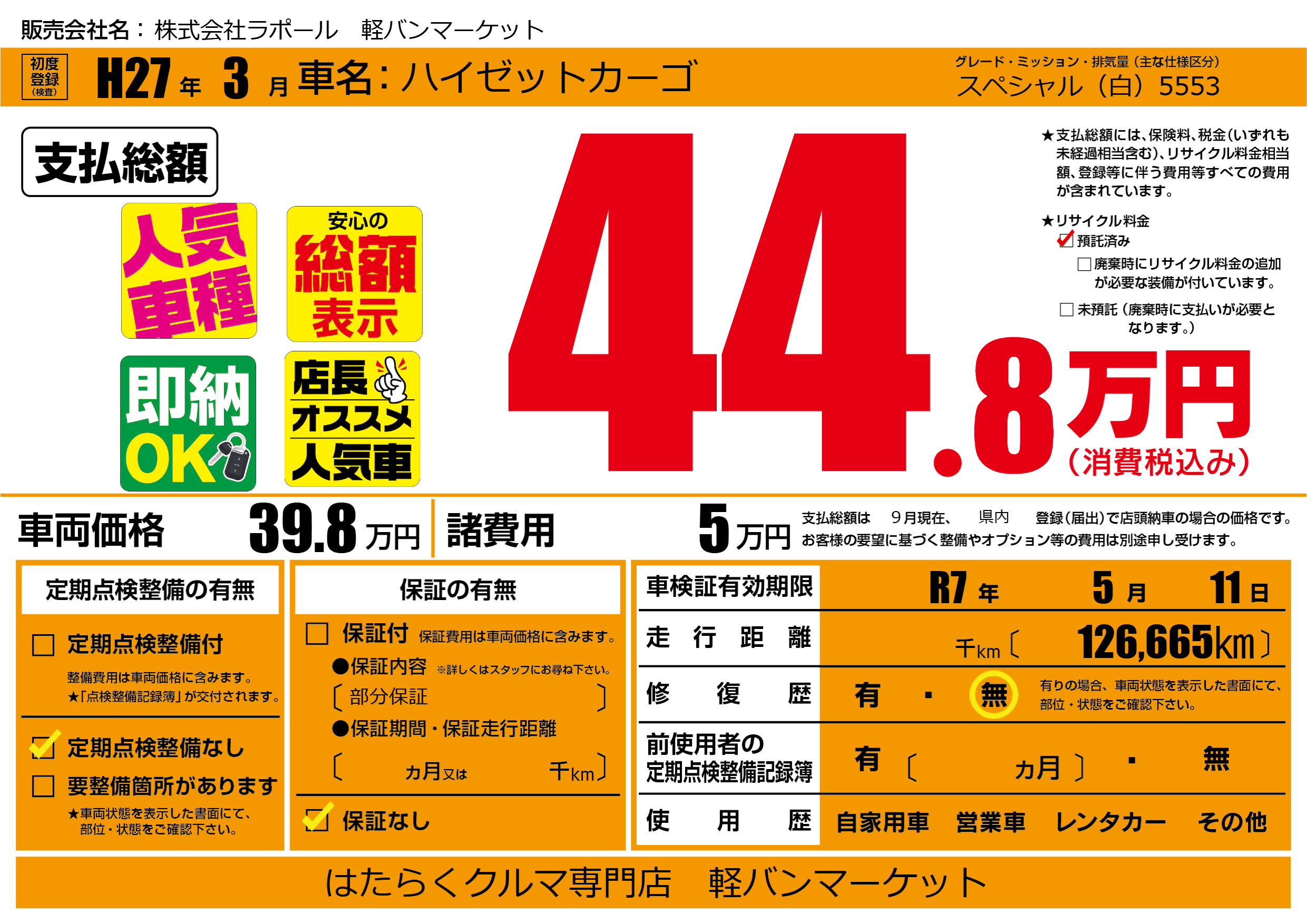 | 走行キロ | - | 初年度登録 | H27年3月 |