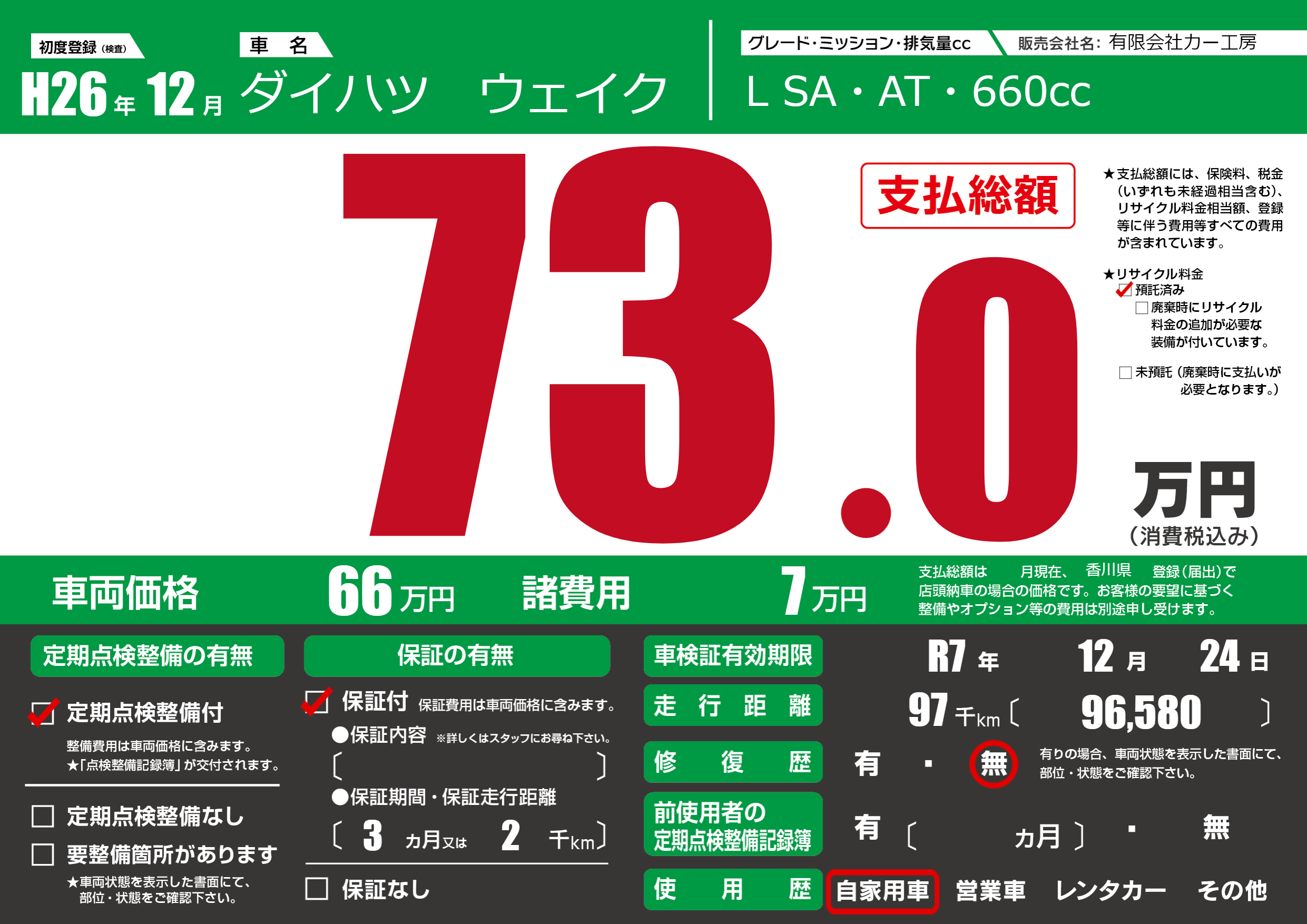 保証付き 保証内容(---) 3ヶ月または(2)千kmまで |