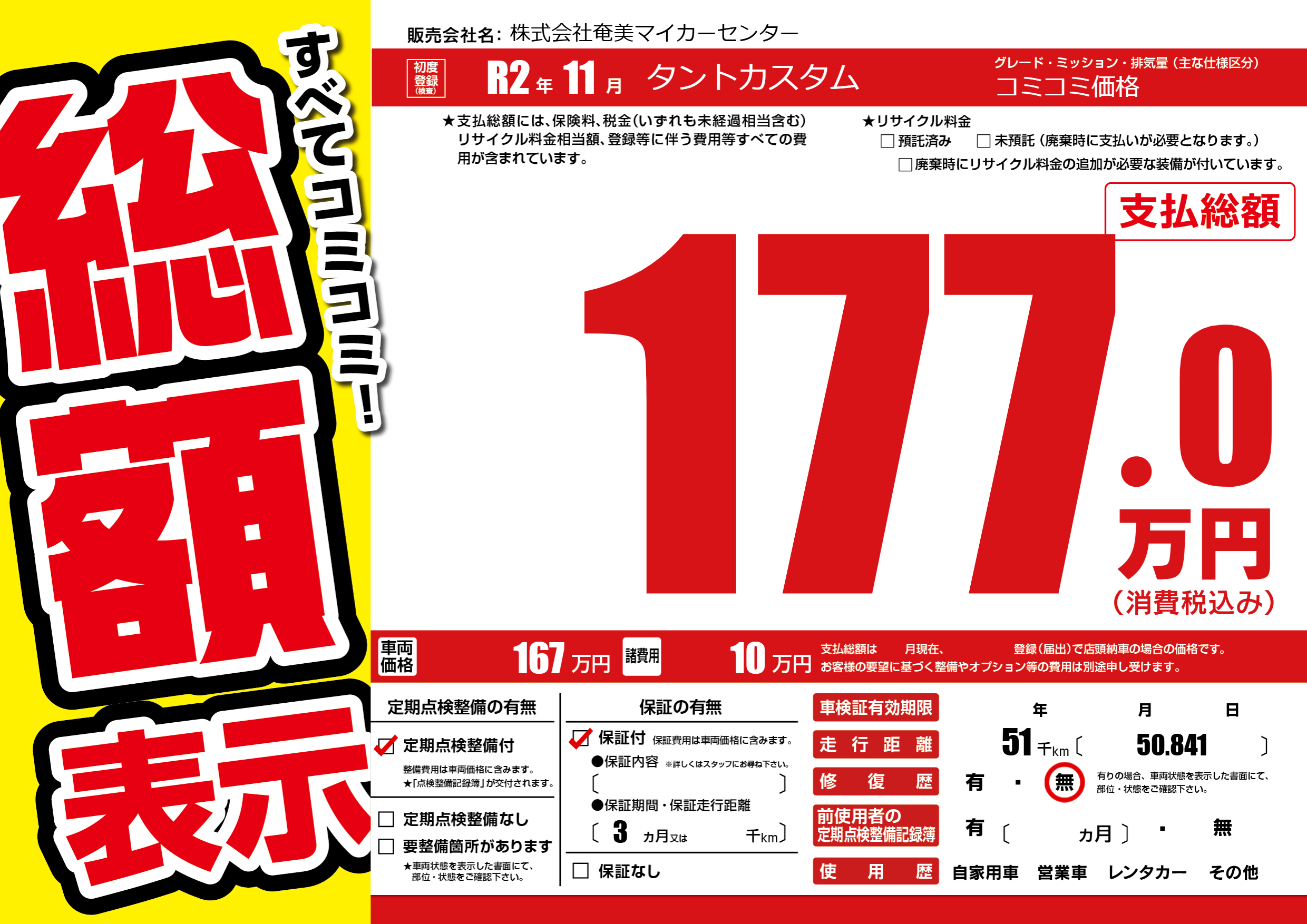 | 車名 | タントカスタム | グレード ミッション 排気量 |