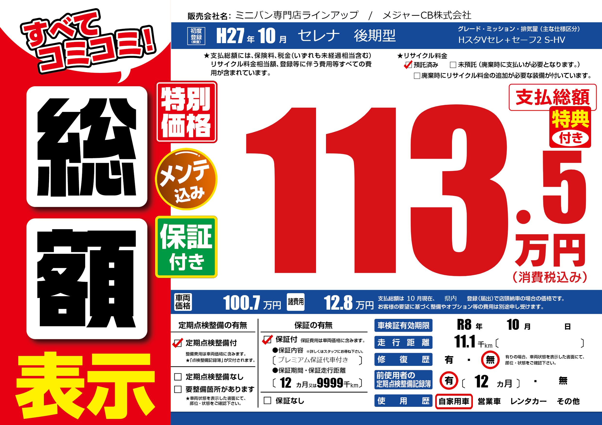 | 車名 | セレナ 後期型 | グレード ミッション 排気量 |