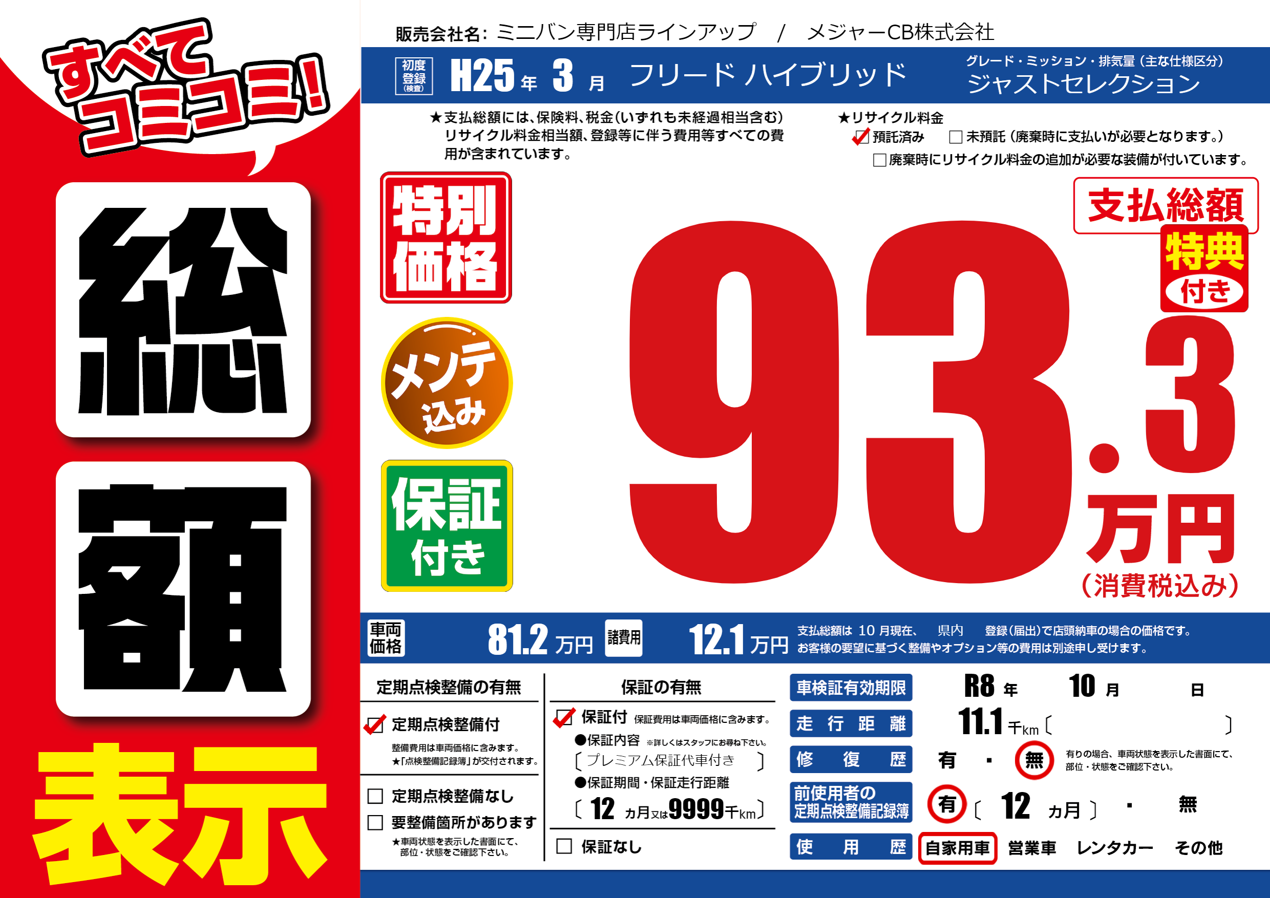 保証付き 保証内容(プレミアム保証代車付き) 12ヶ月または(9999)千kmまで |