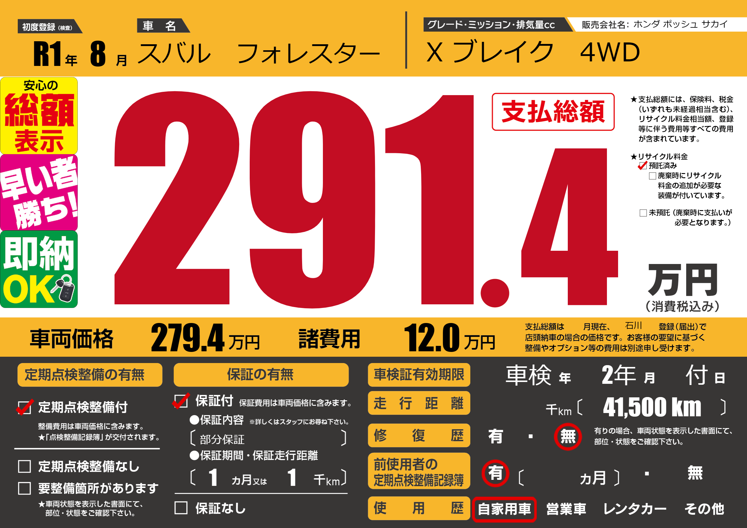 | 車名 | スバル フォレスター | グレード ミッション 排気量 |