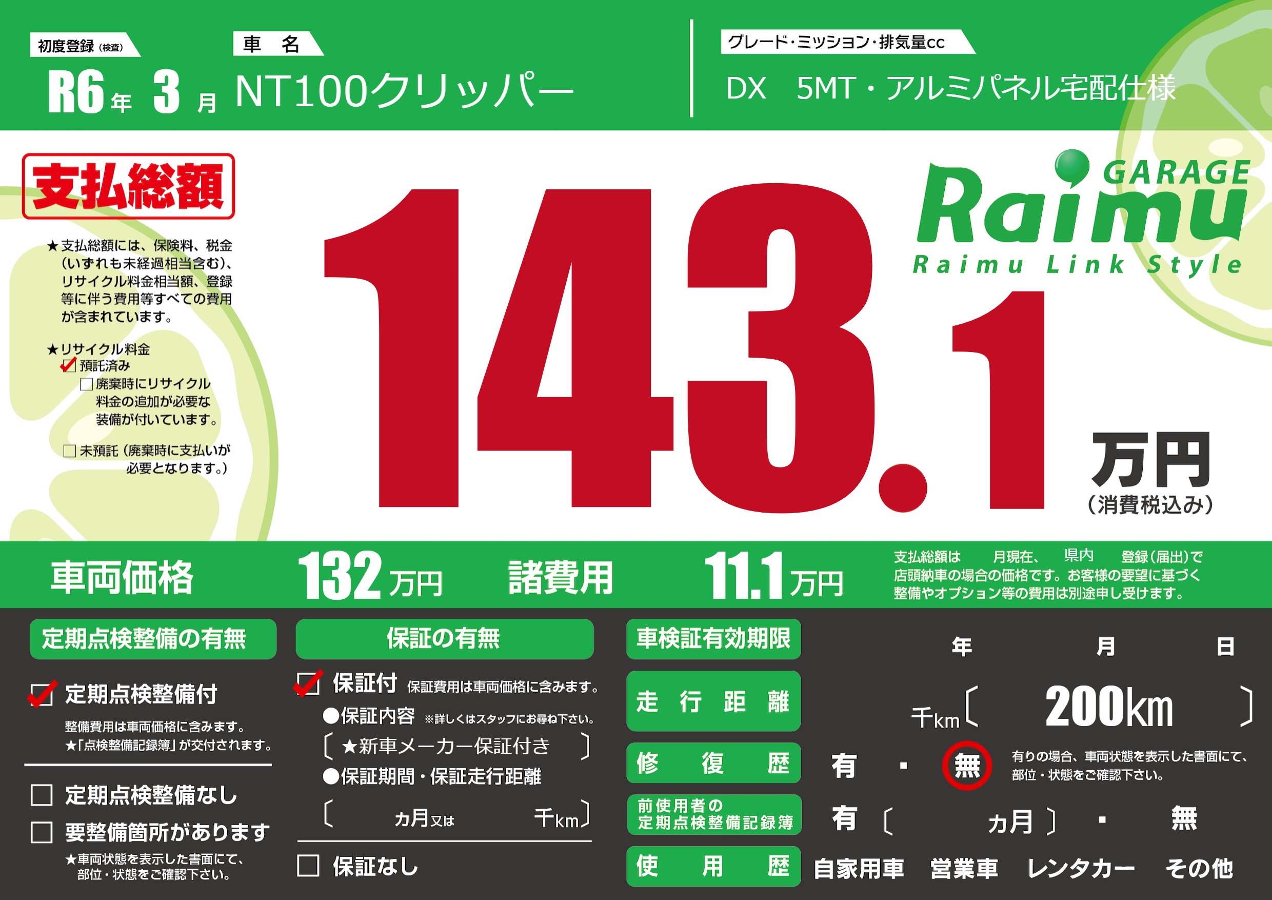 | 車名 | NT100クリッパー | グレード ミッション 排気量 |