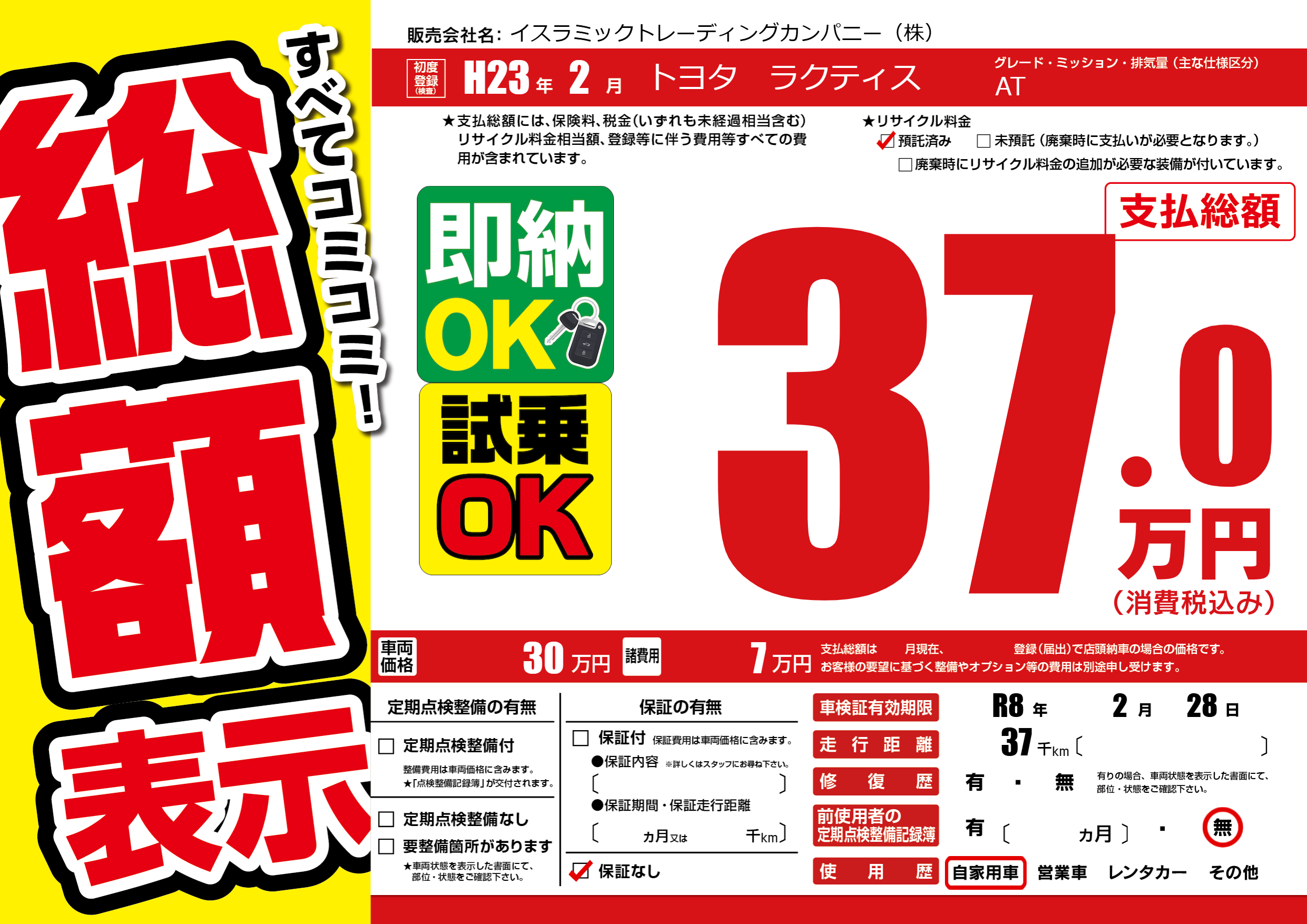 | 車名 | トヨタ ラクティス | グレード ミッション 排気量 |
