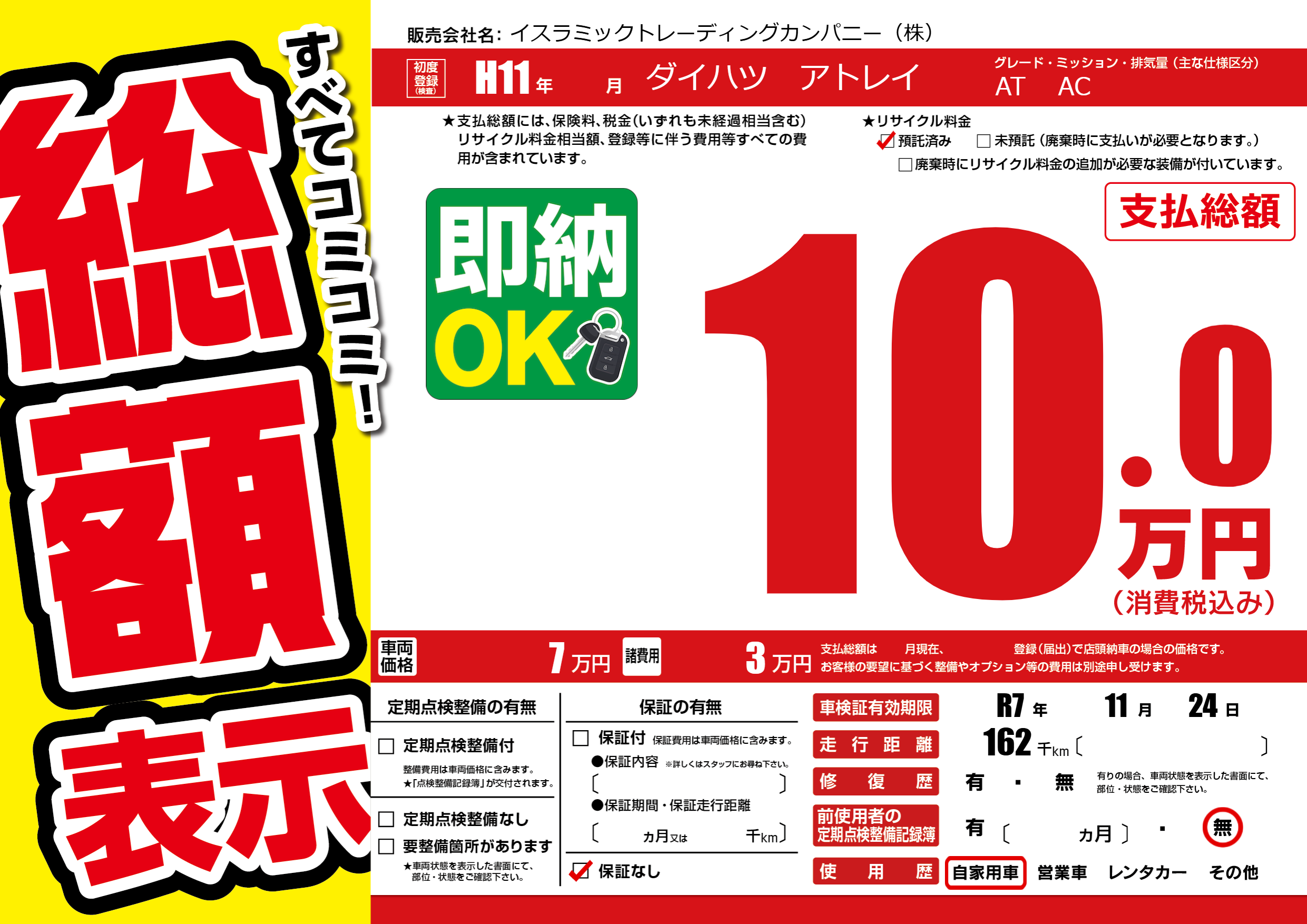 | 走行キロ | 16.2万km | 初年度登録 | H11年---月 |