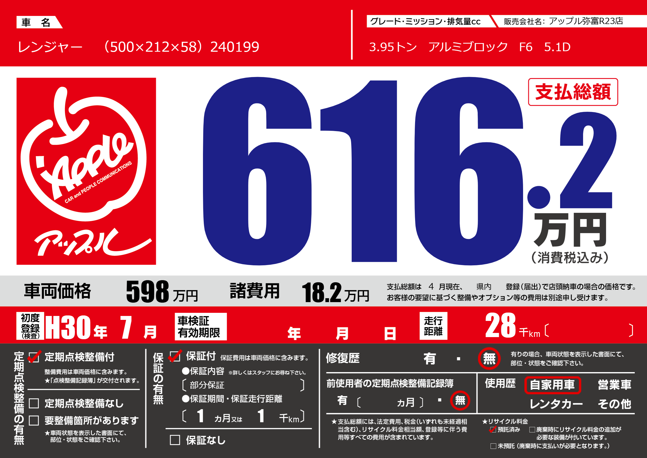 | 車名 | レンジャー (500×212×58)240199 | グレード ミッション 排気量 |