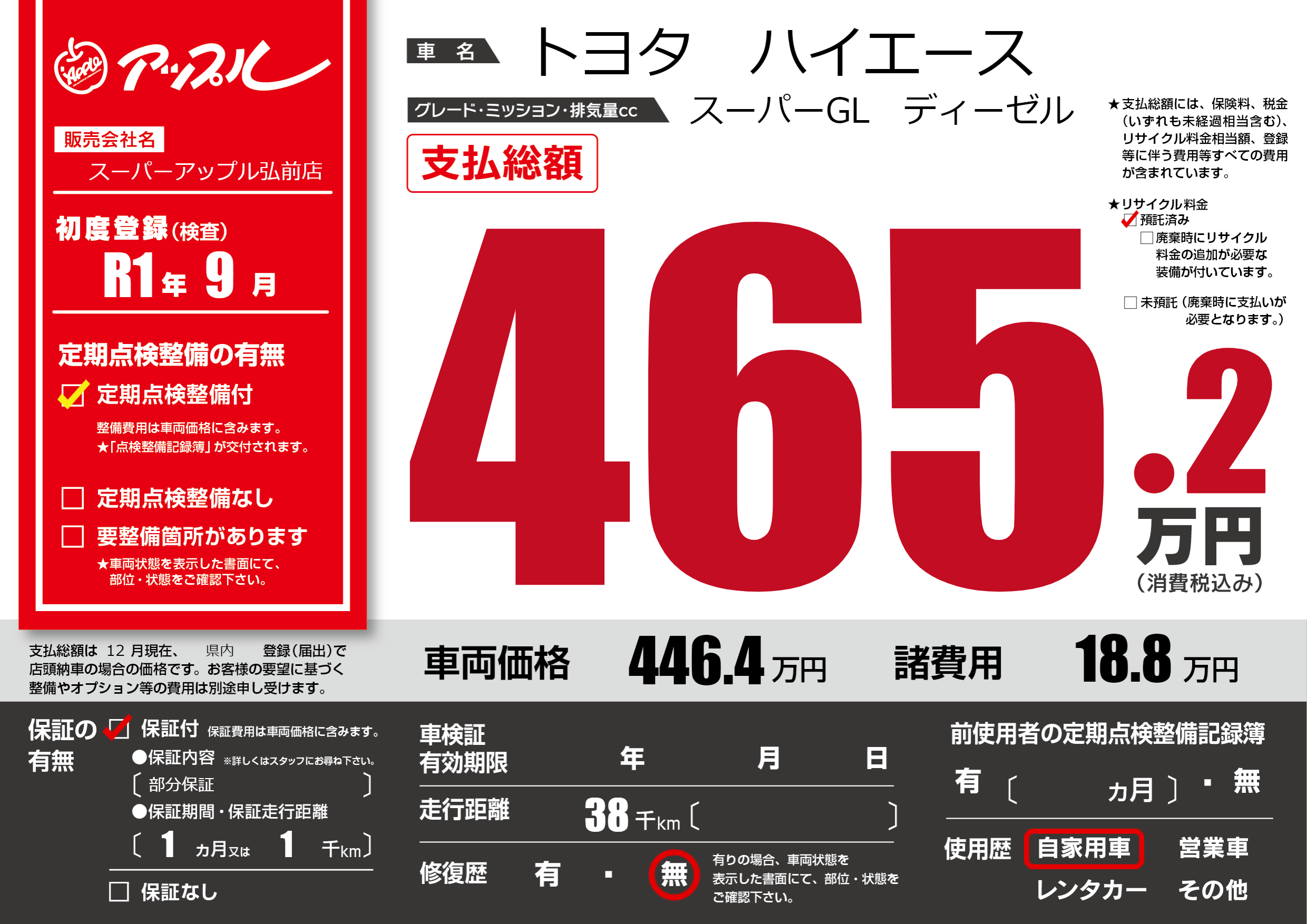 | 走行キロ | 3.8万km | 初年度登録 | R1年9月 |